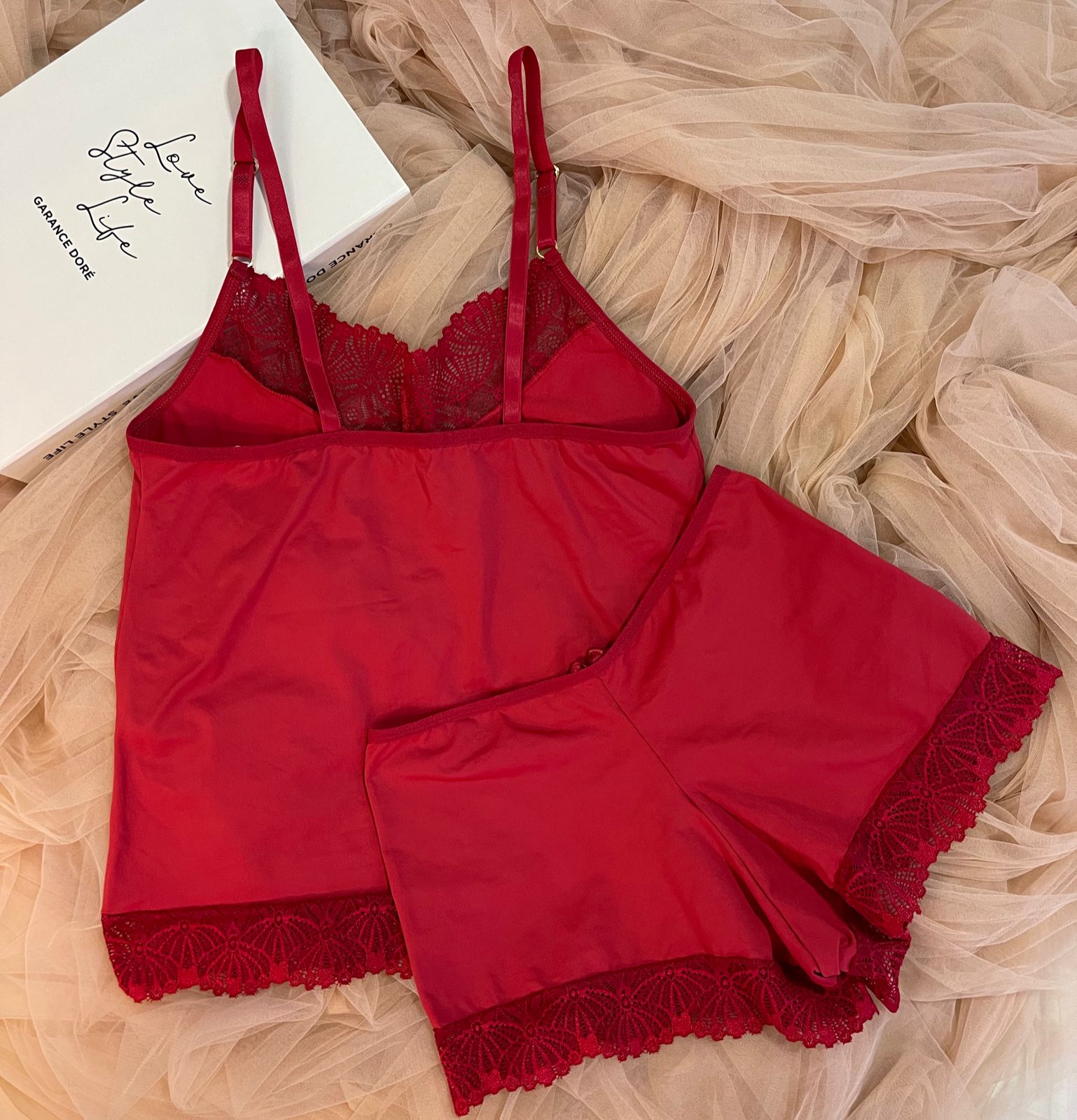 A regata tem alças reguláveis, em formato de coração banhado à ouro 24k. O shorts tem elástico na cintura e barra de renda.