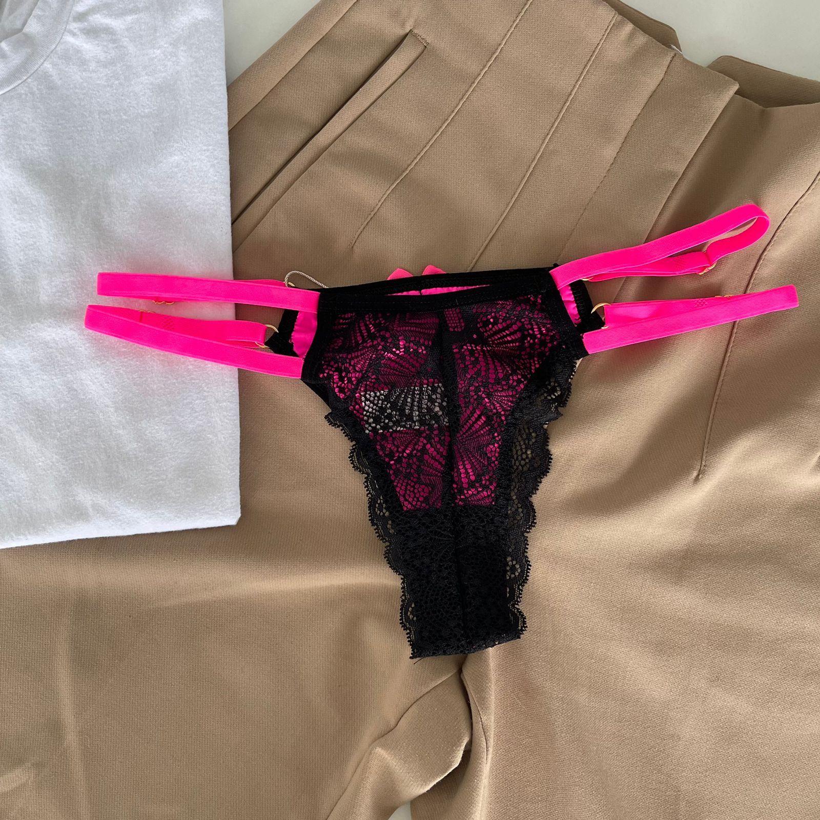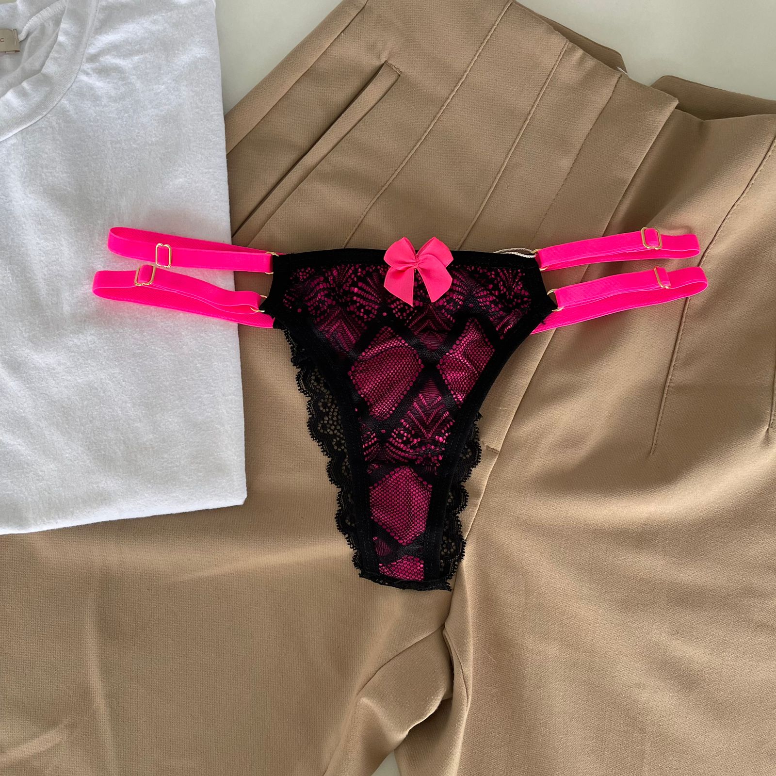 Calcinha string dupla fio dental preto com rosa neon – Mia