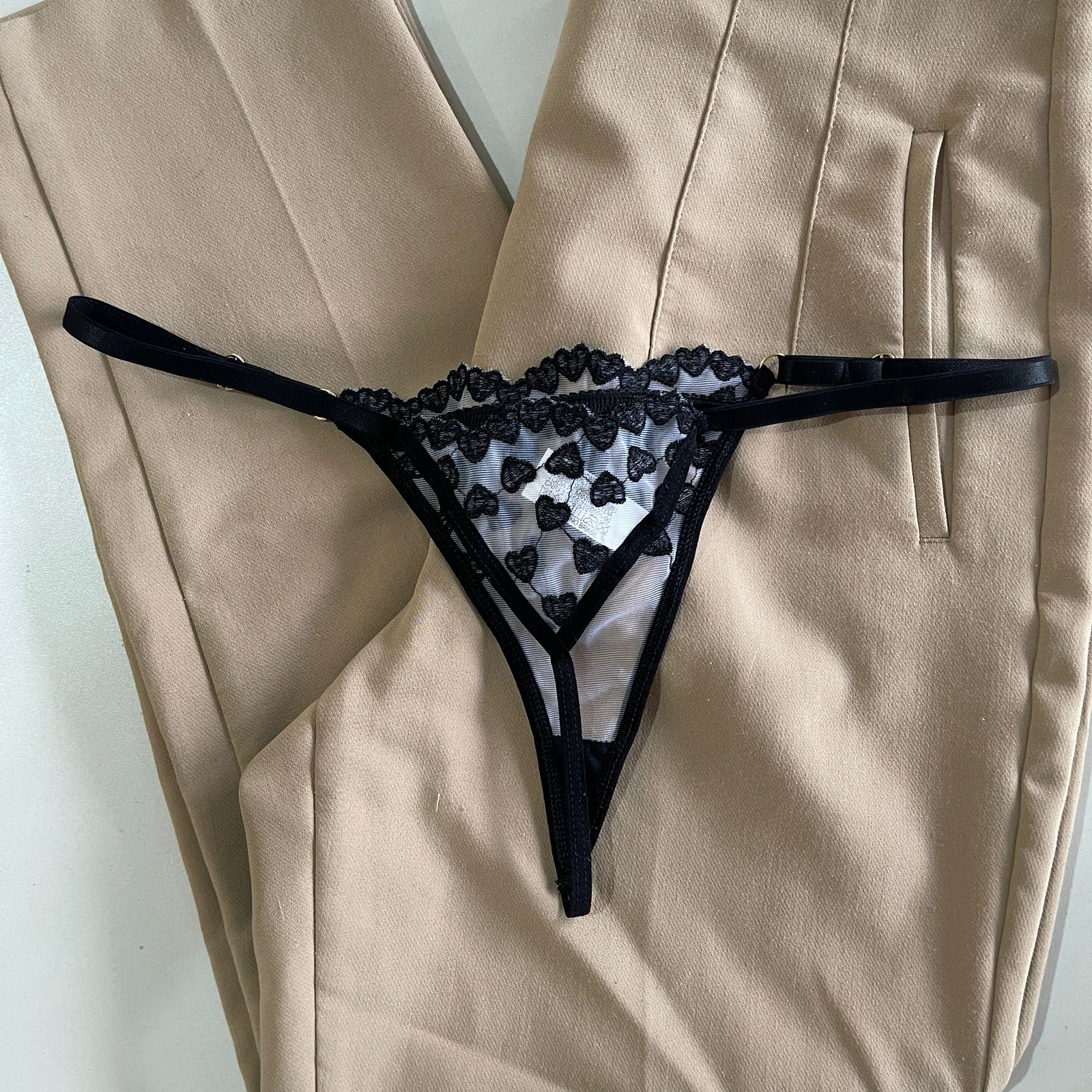 A calcinha Vicky possui reguladores em formato de coração. Fio dental atrás.