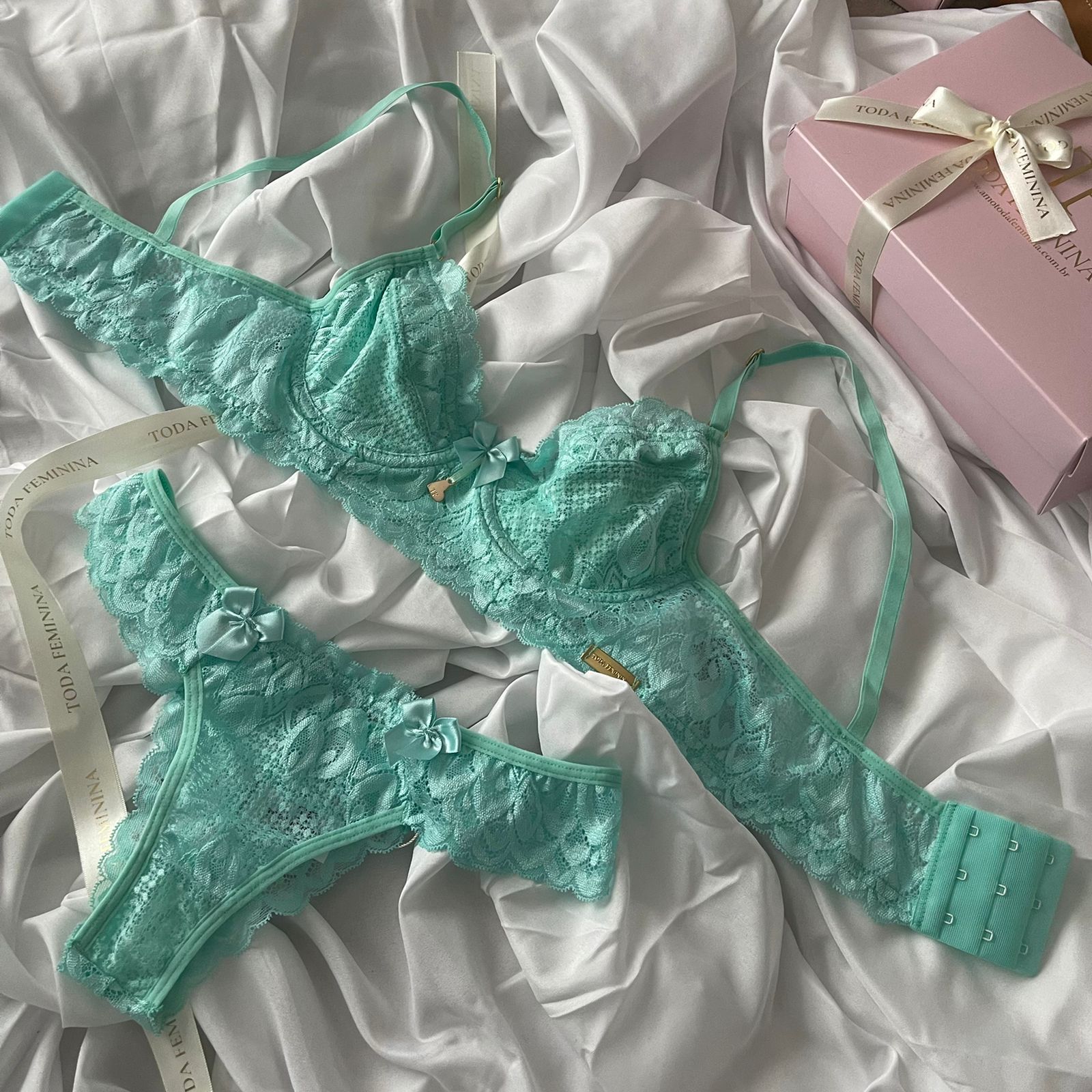Conjunto de lingerie em renda sutiã sem bojo com aro e calcinha biquíni verde acqua – Anne