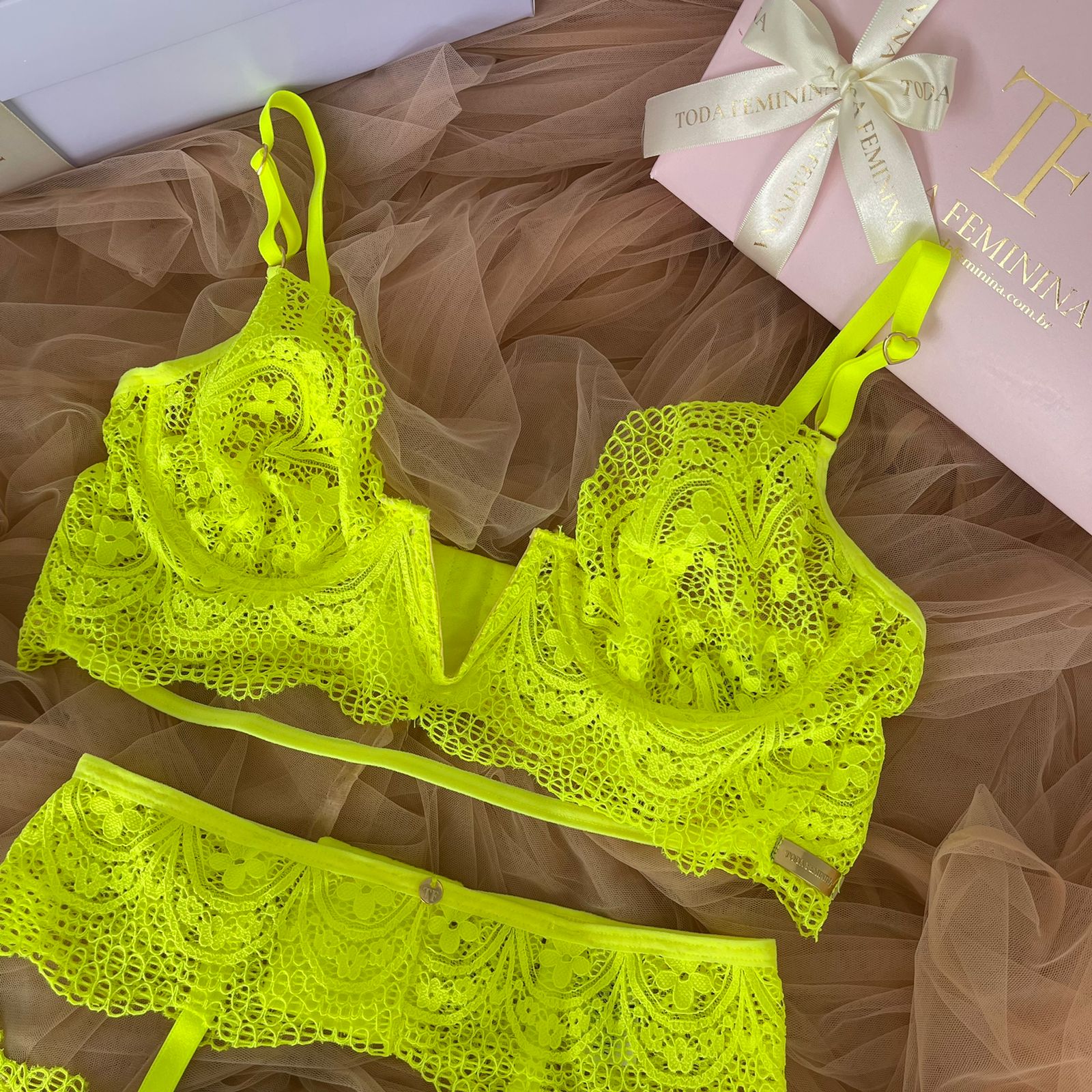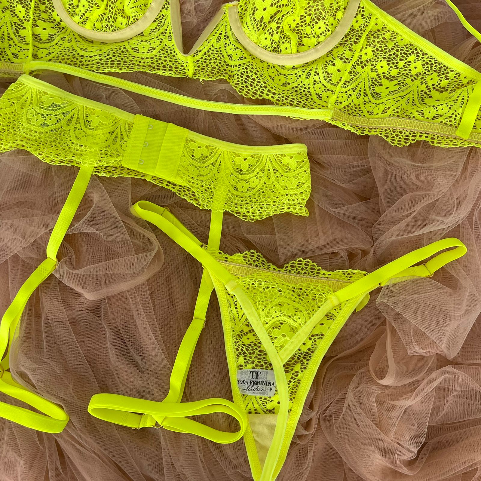 Conjunto de lingerie em renda cinta liga sem bojo com aro verde neon – Scarlet