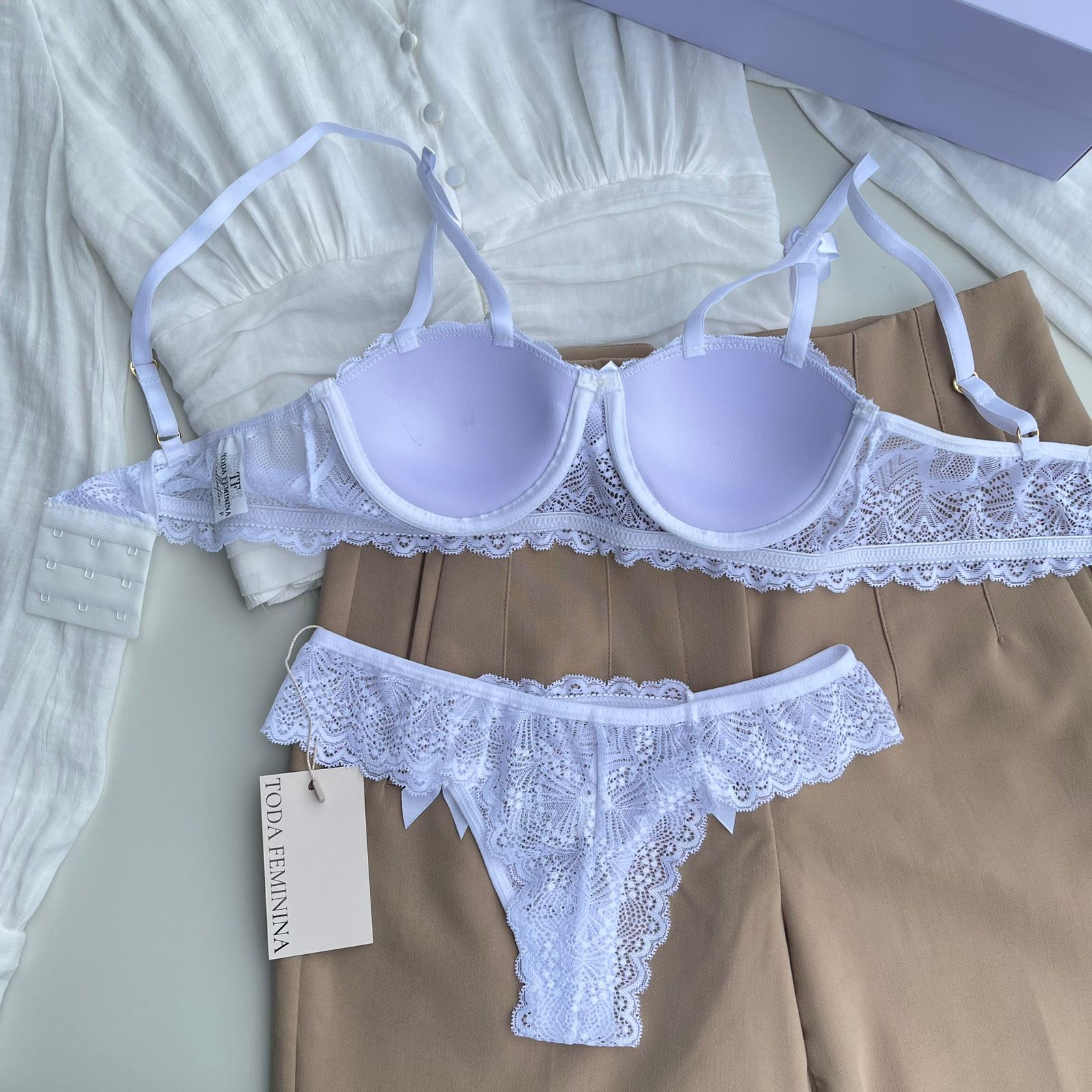 Conjunto de lingerie em renda com bojo e calcinha biquíni branco – Katherine