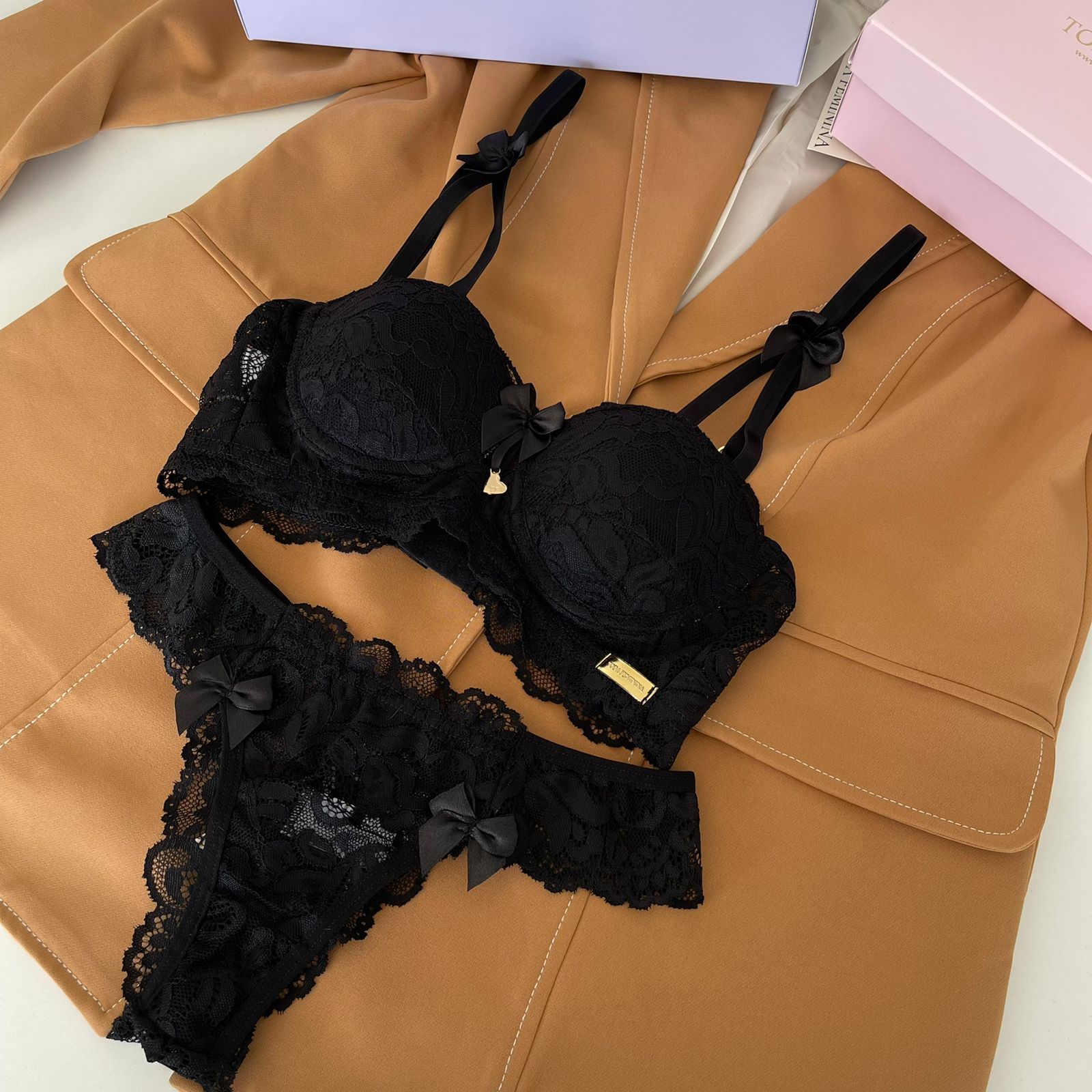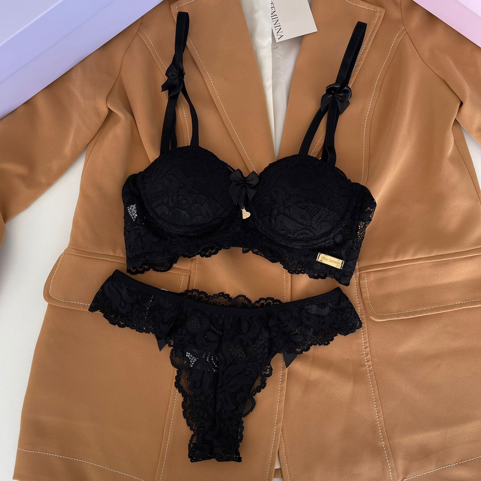 Conjunto de lingerie em renda com bojo e calcinha biquíni preto – Katherine