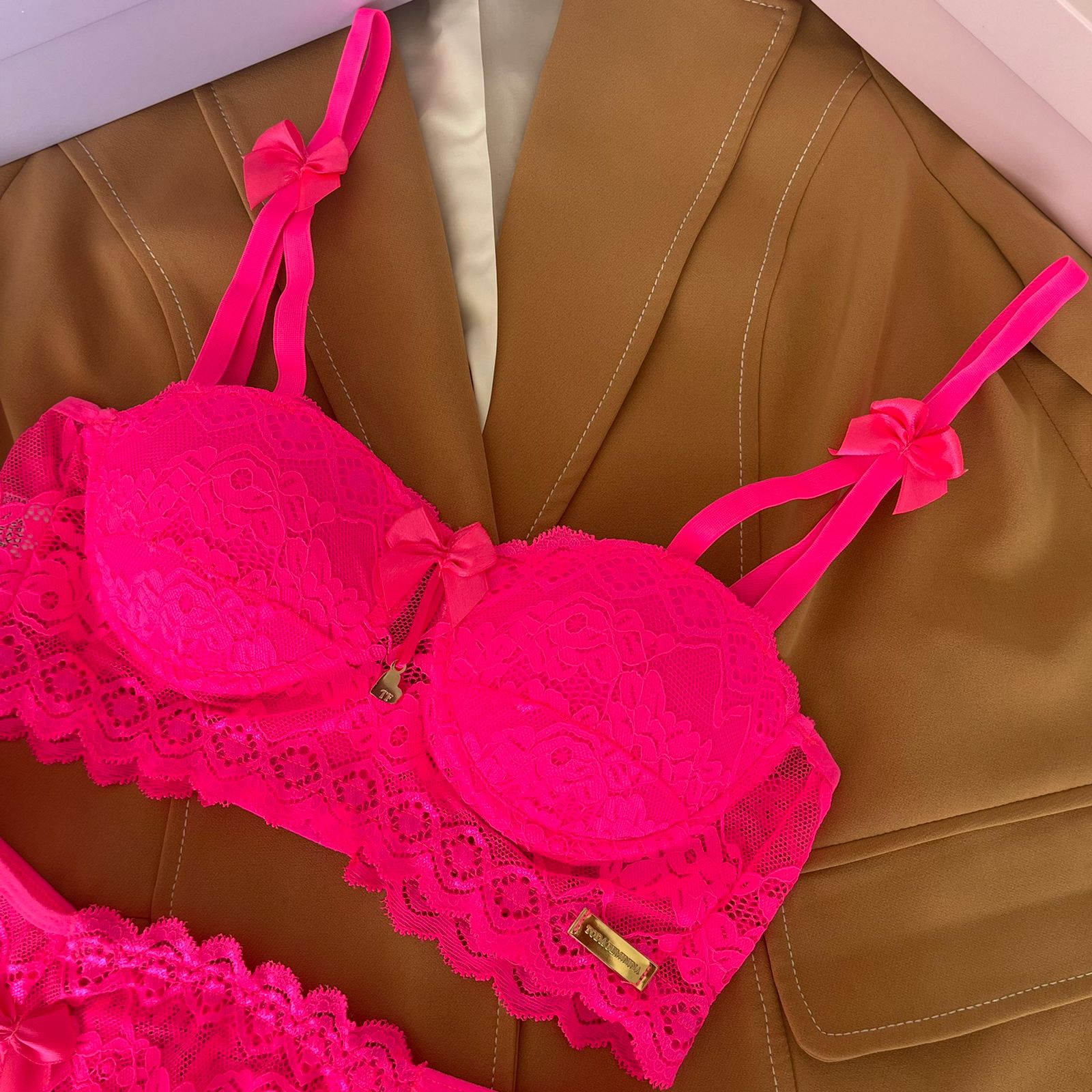 Conjunto de lingerie em renda com bojo e calcinha biquíni rosa neon – Katherine