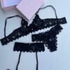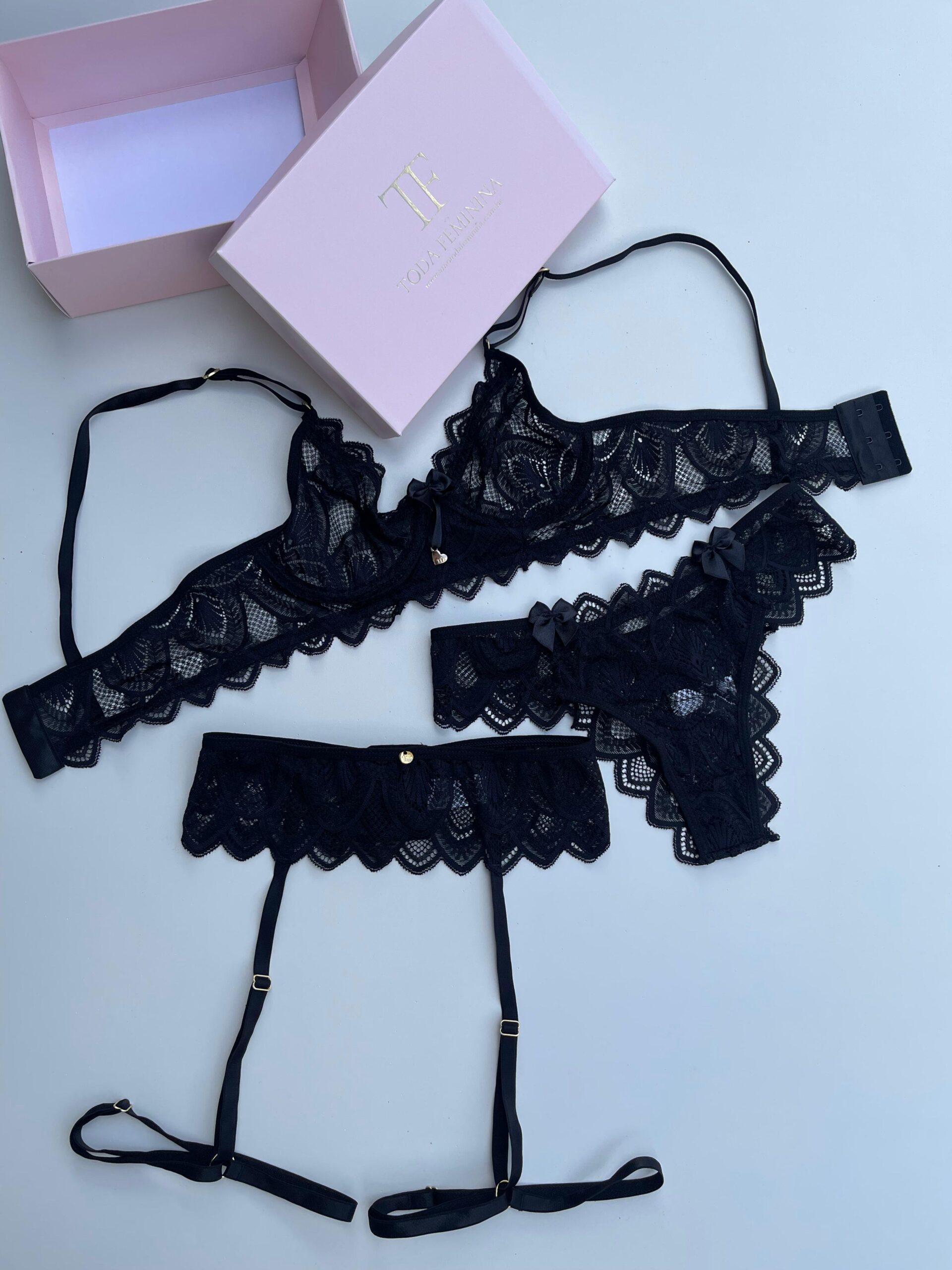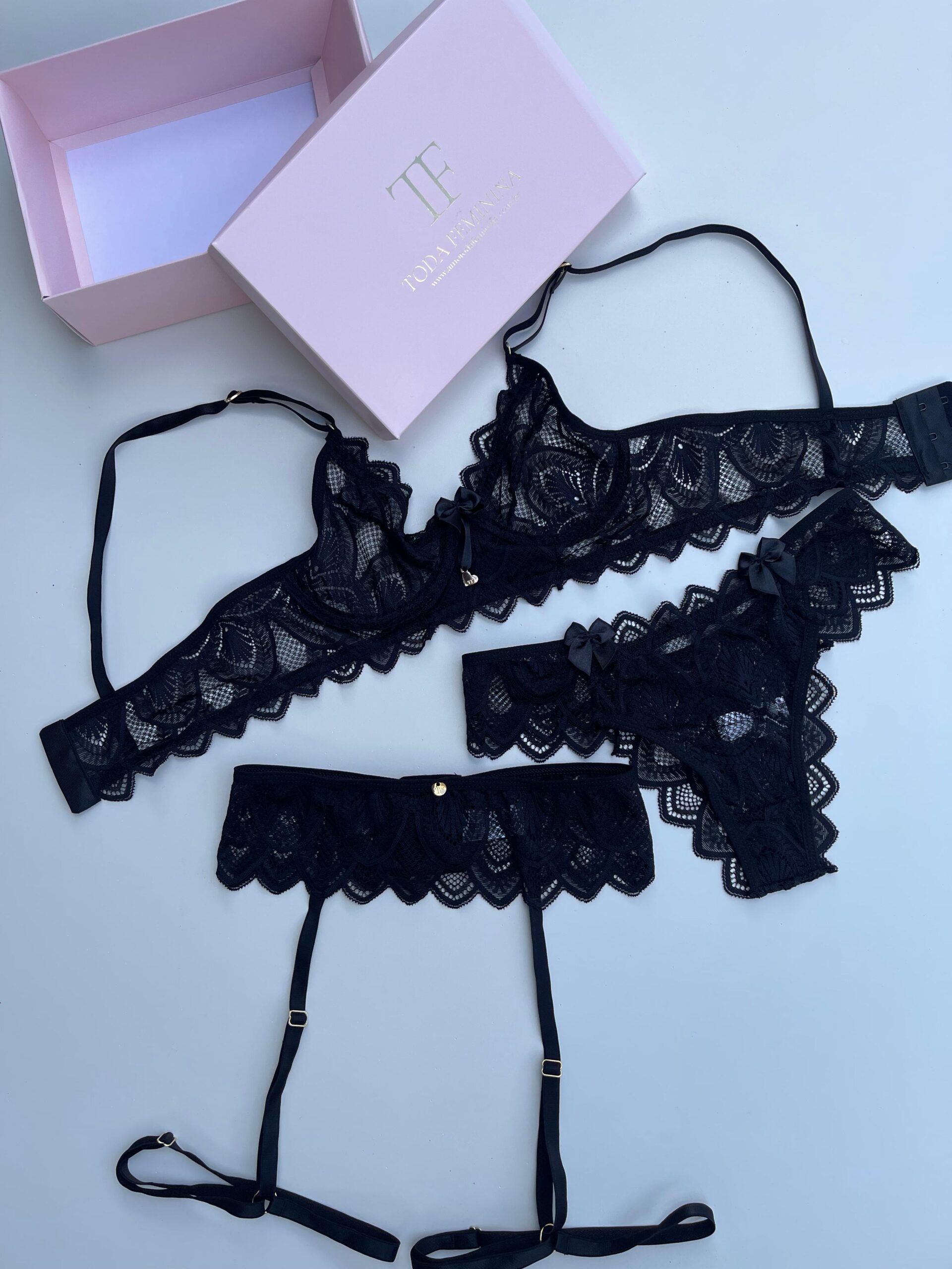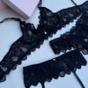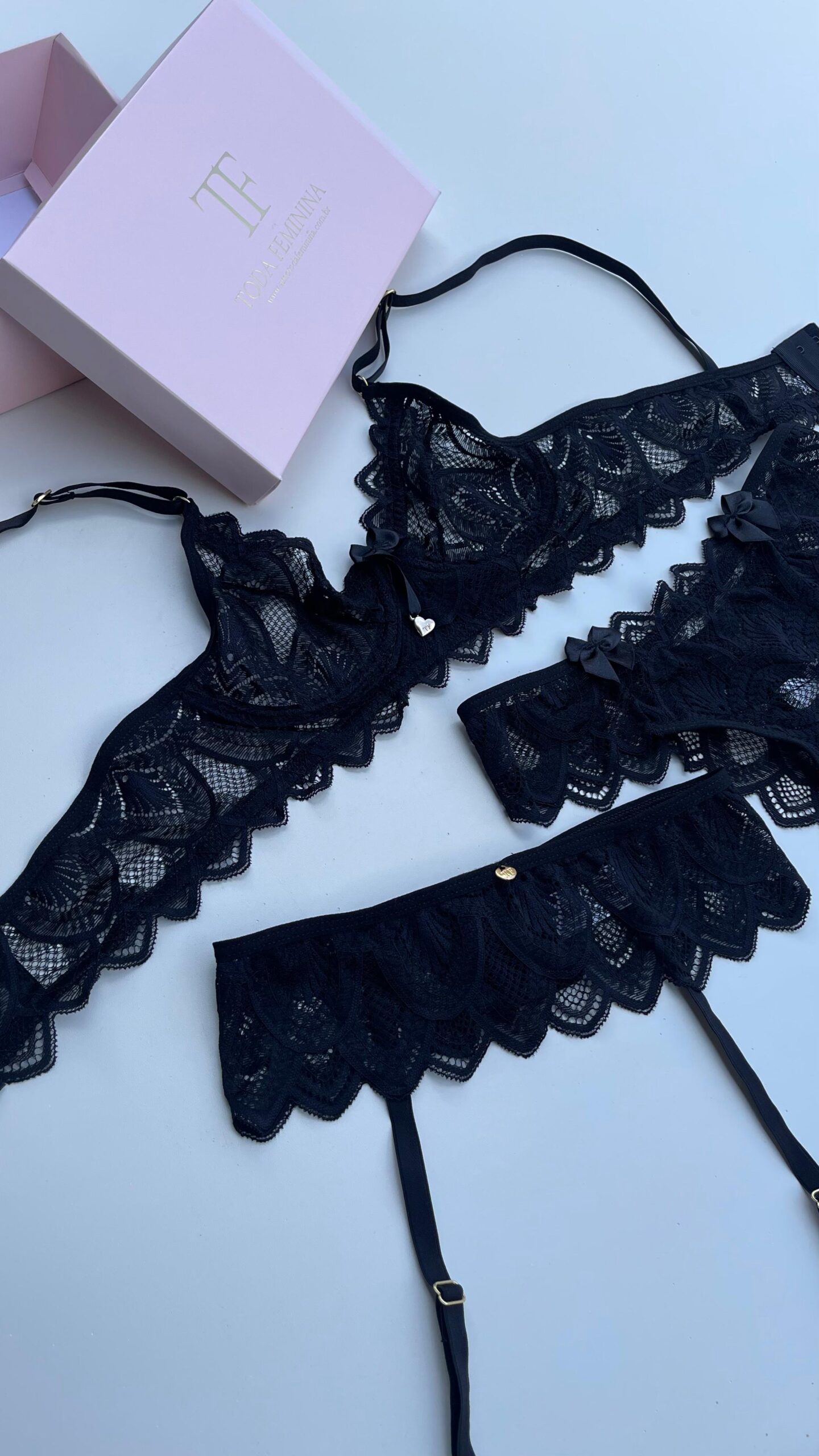 Conjunto De Lingerie Em Renda Sem Bojo Com Aro Sem Forro Preto – Cinta Liga