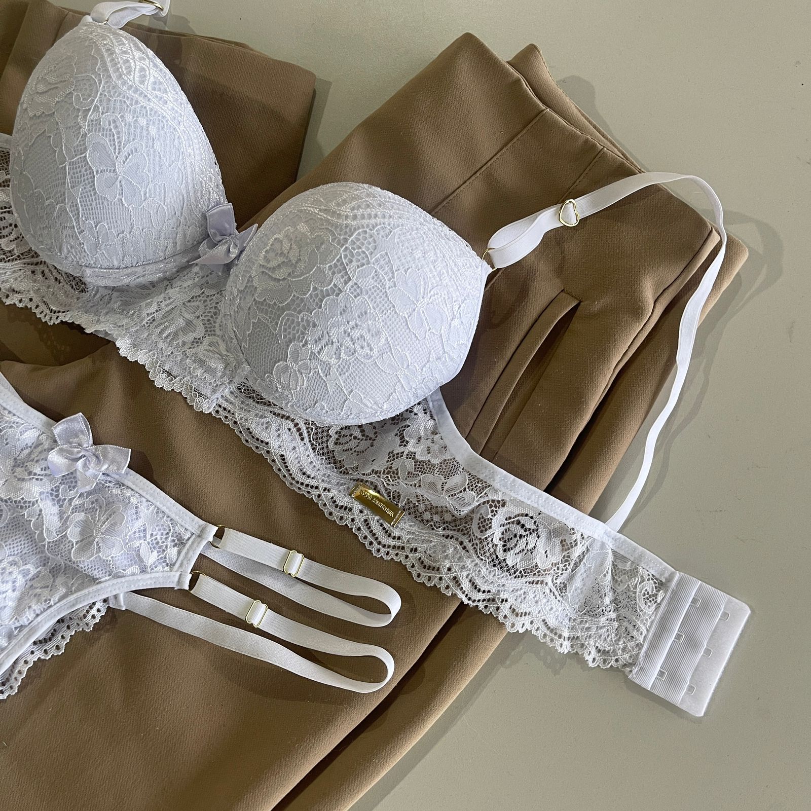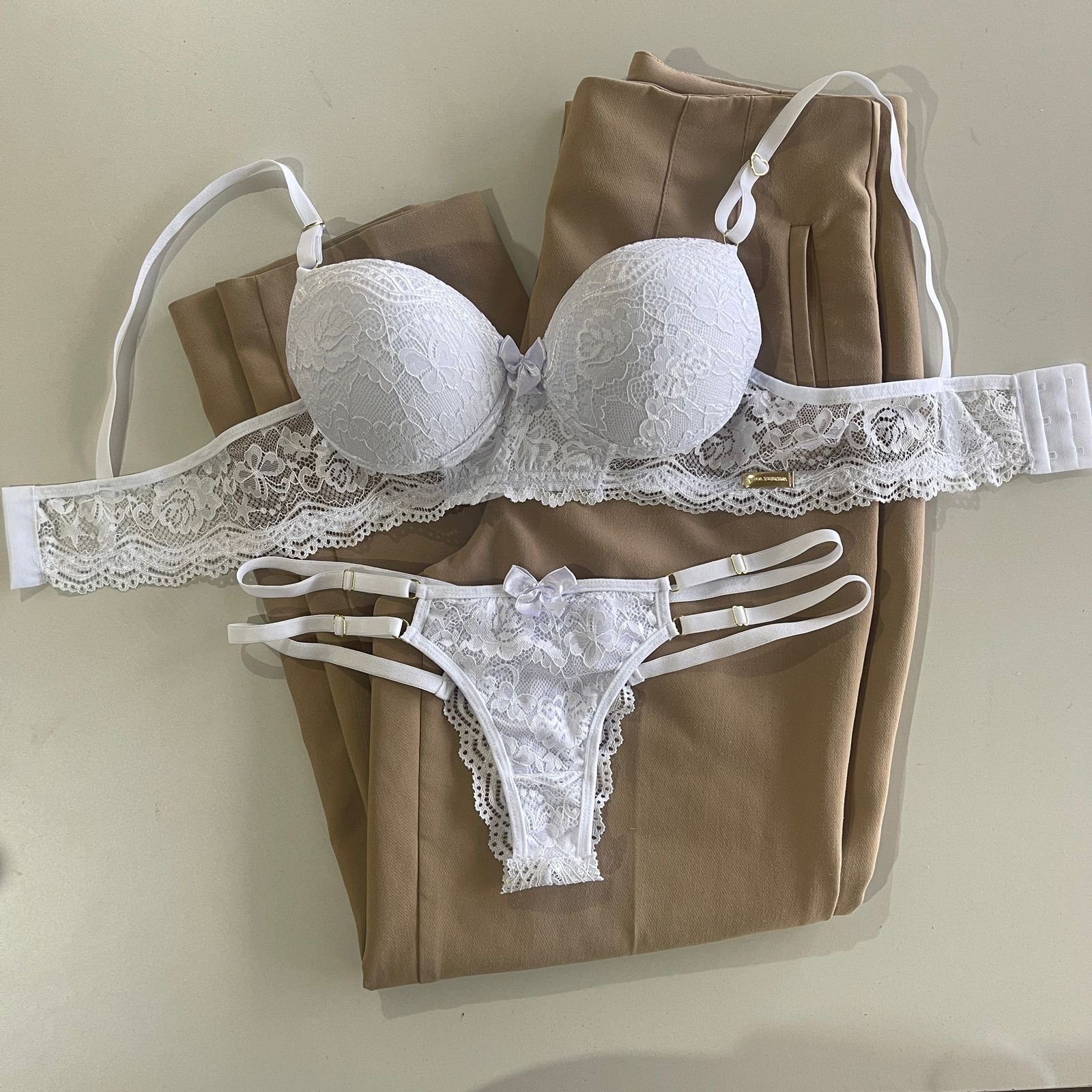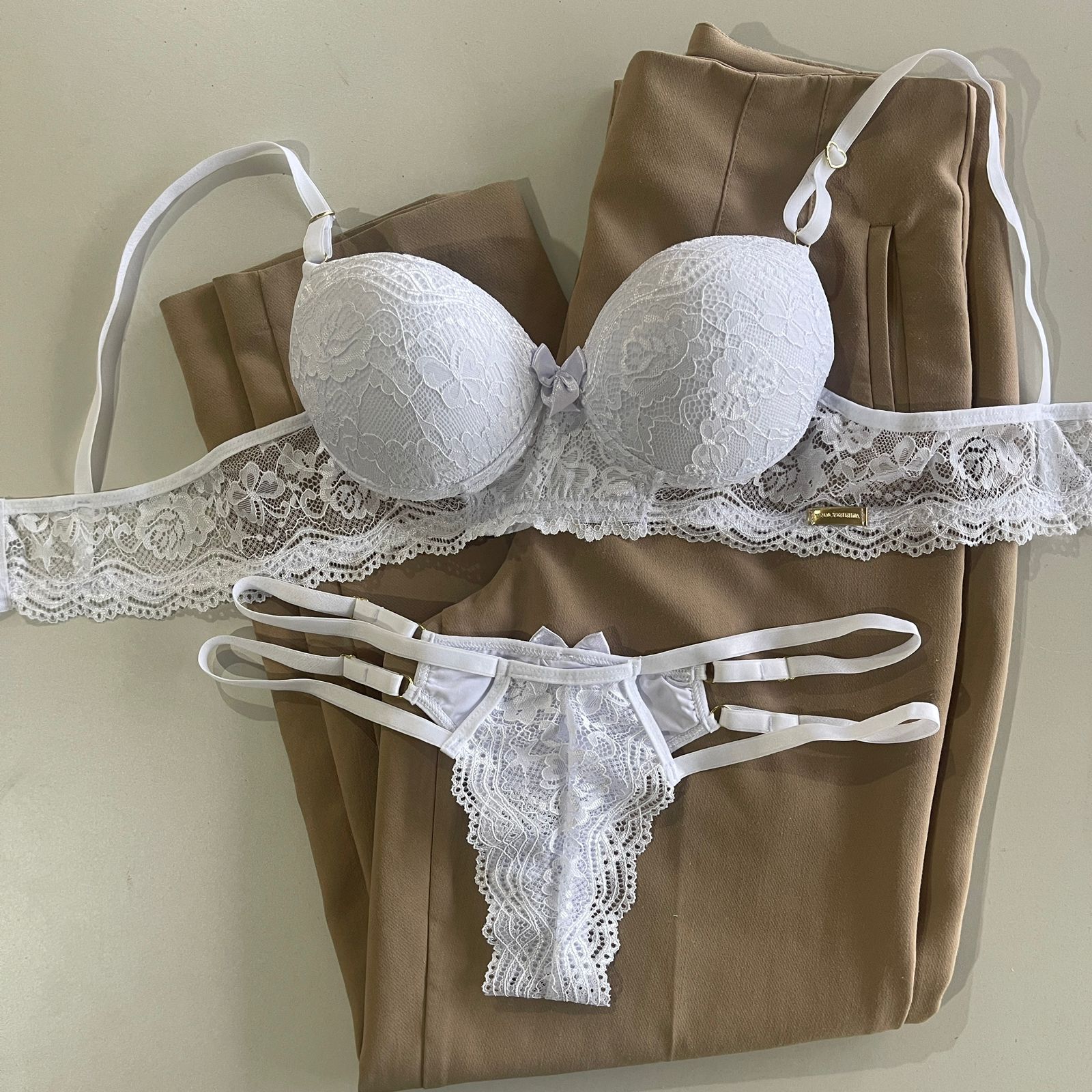 Conjunto de lingerie em renda sutiã com bojo e calcinha string dupla fio dental branco – Mia