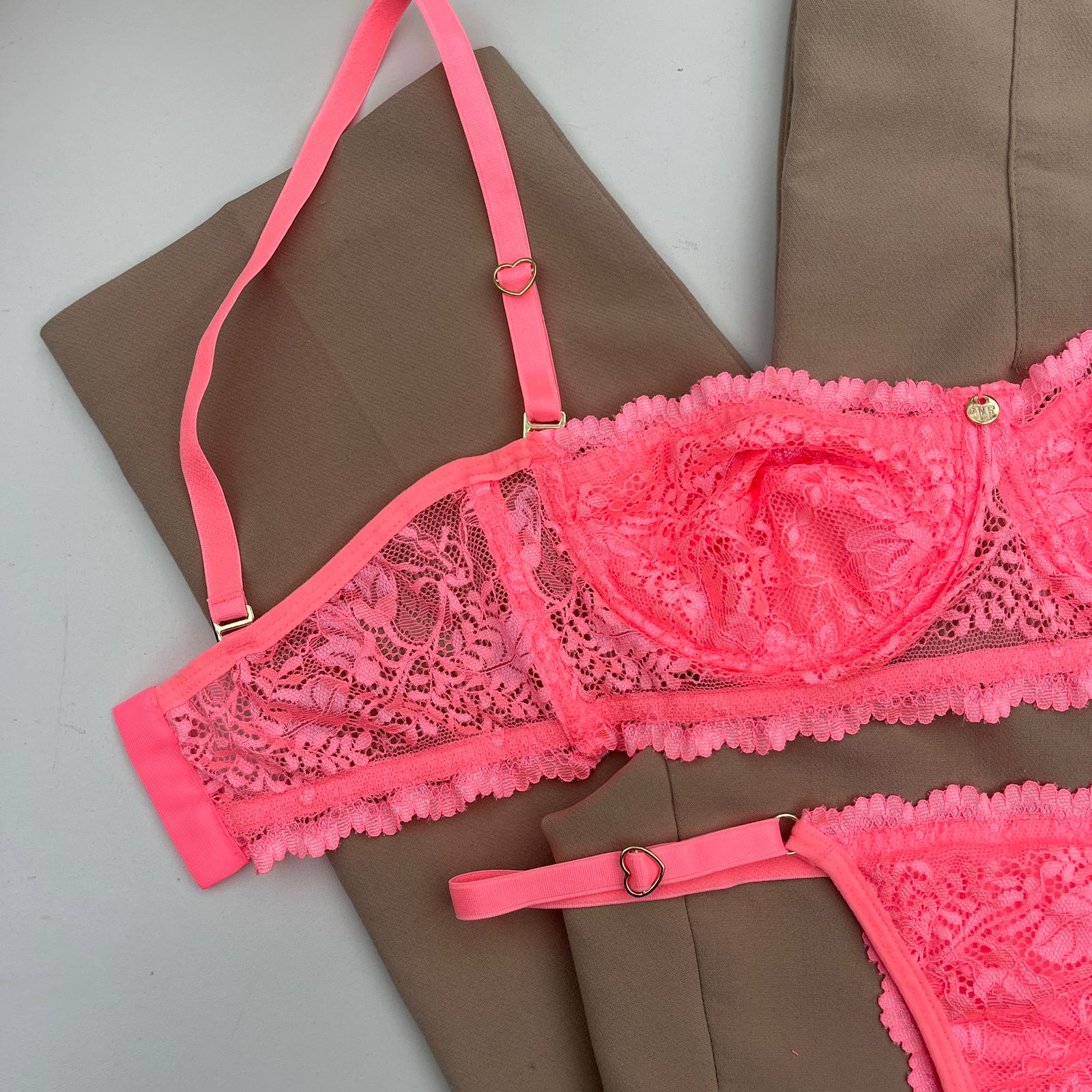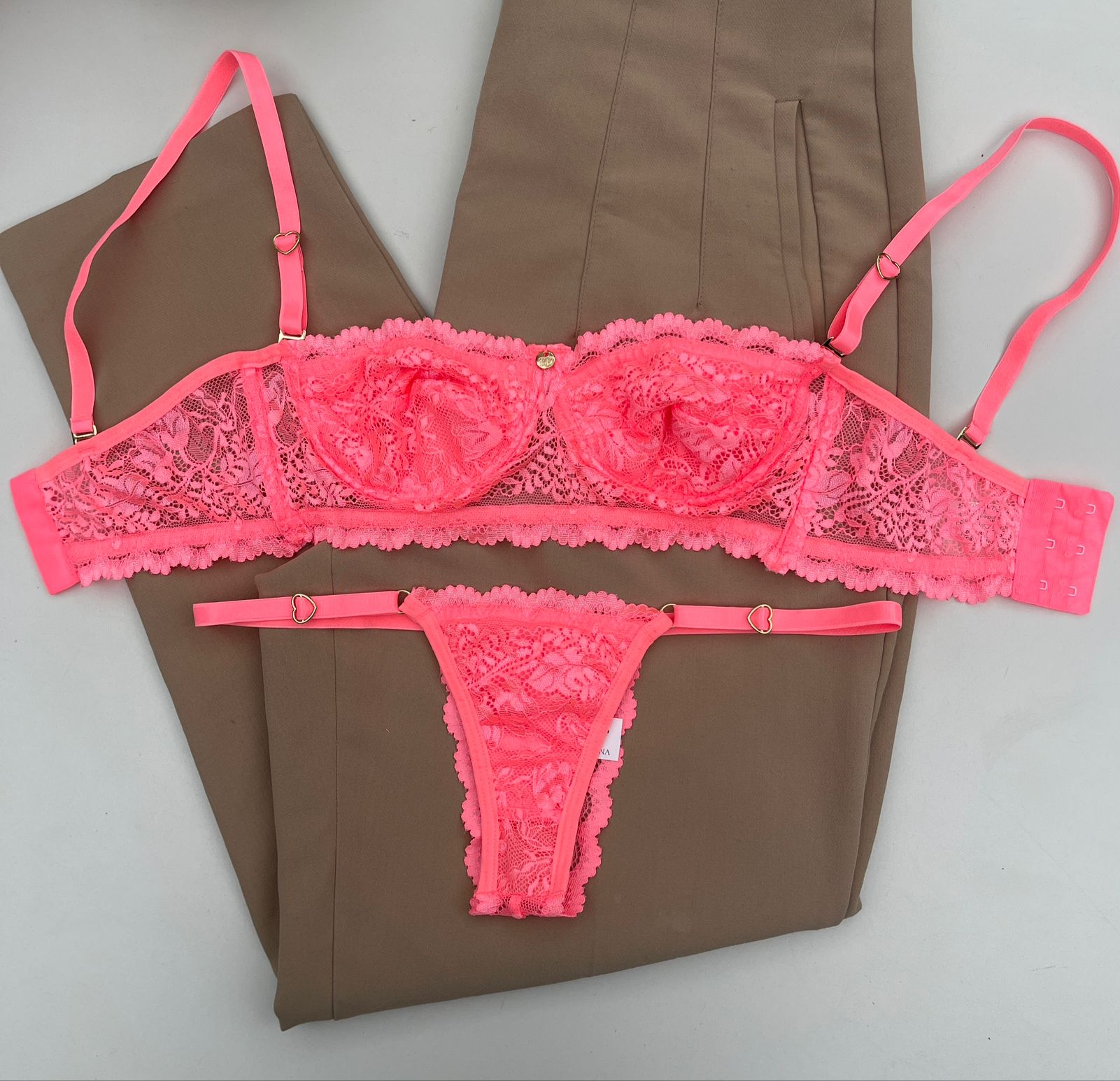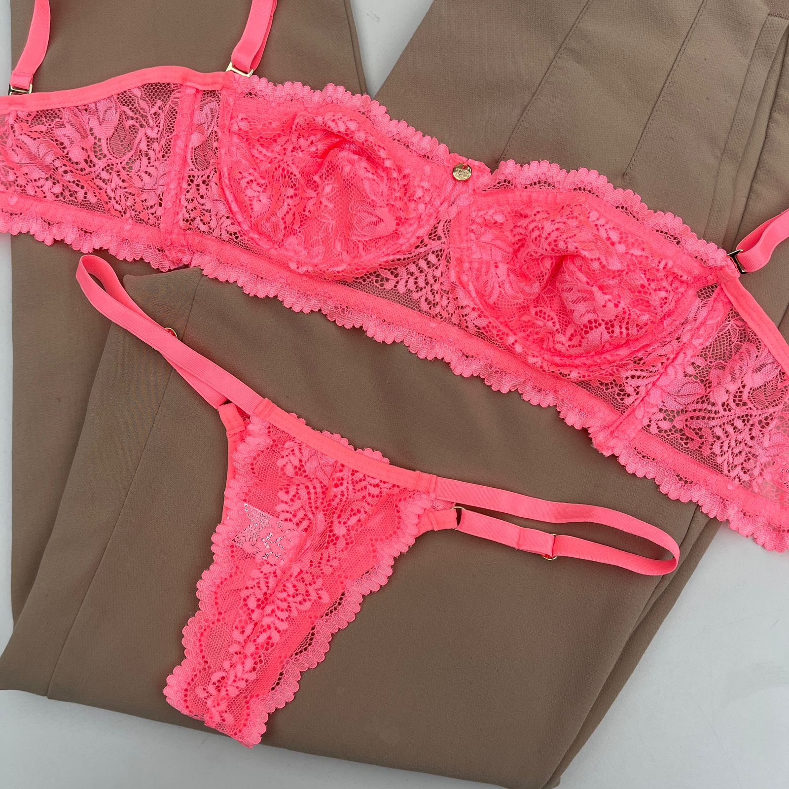 Conjunto de lingerie tomara que caia sutiã sem bojo com aro e calcinha string fio dental coral – Jasmine