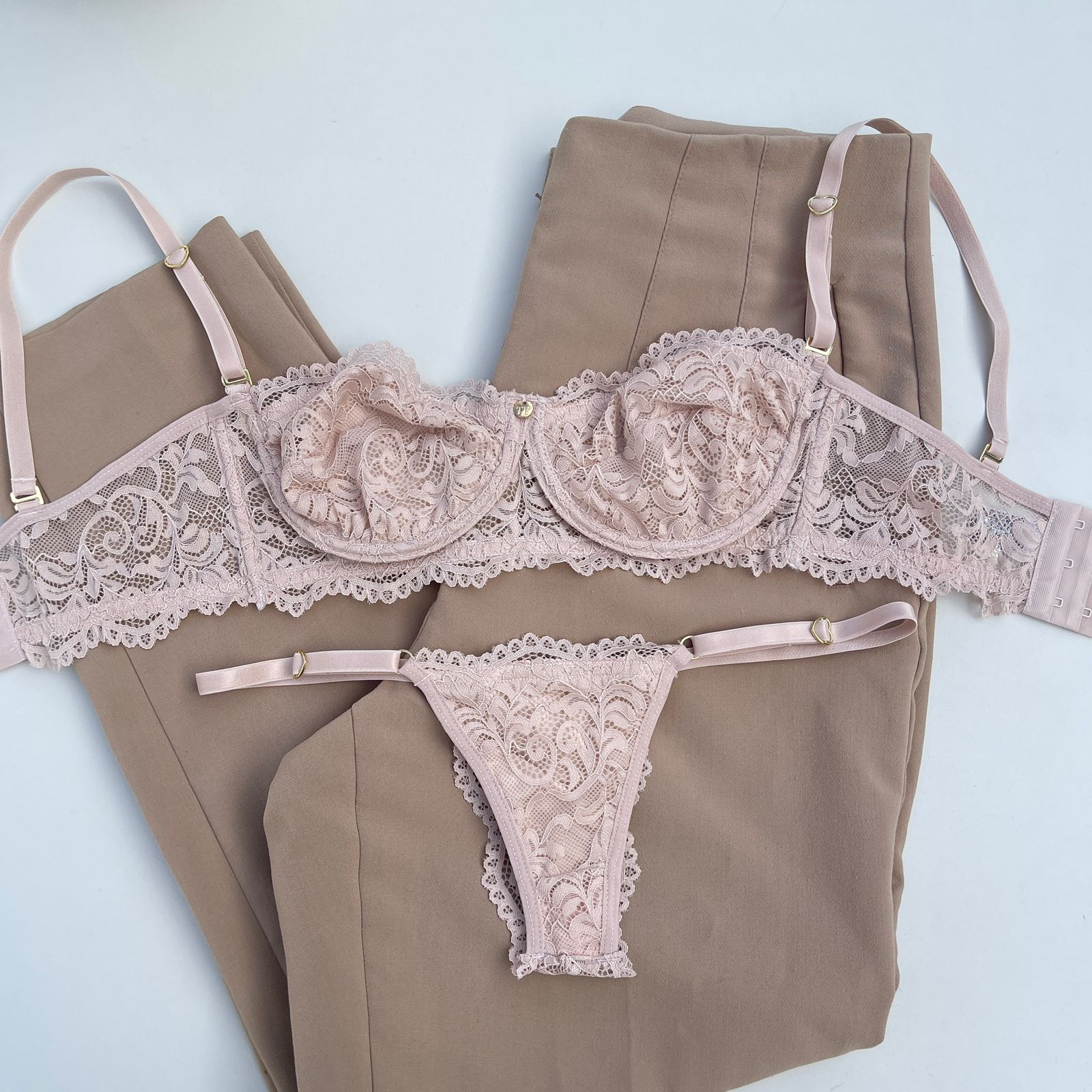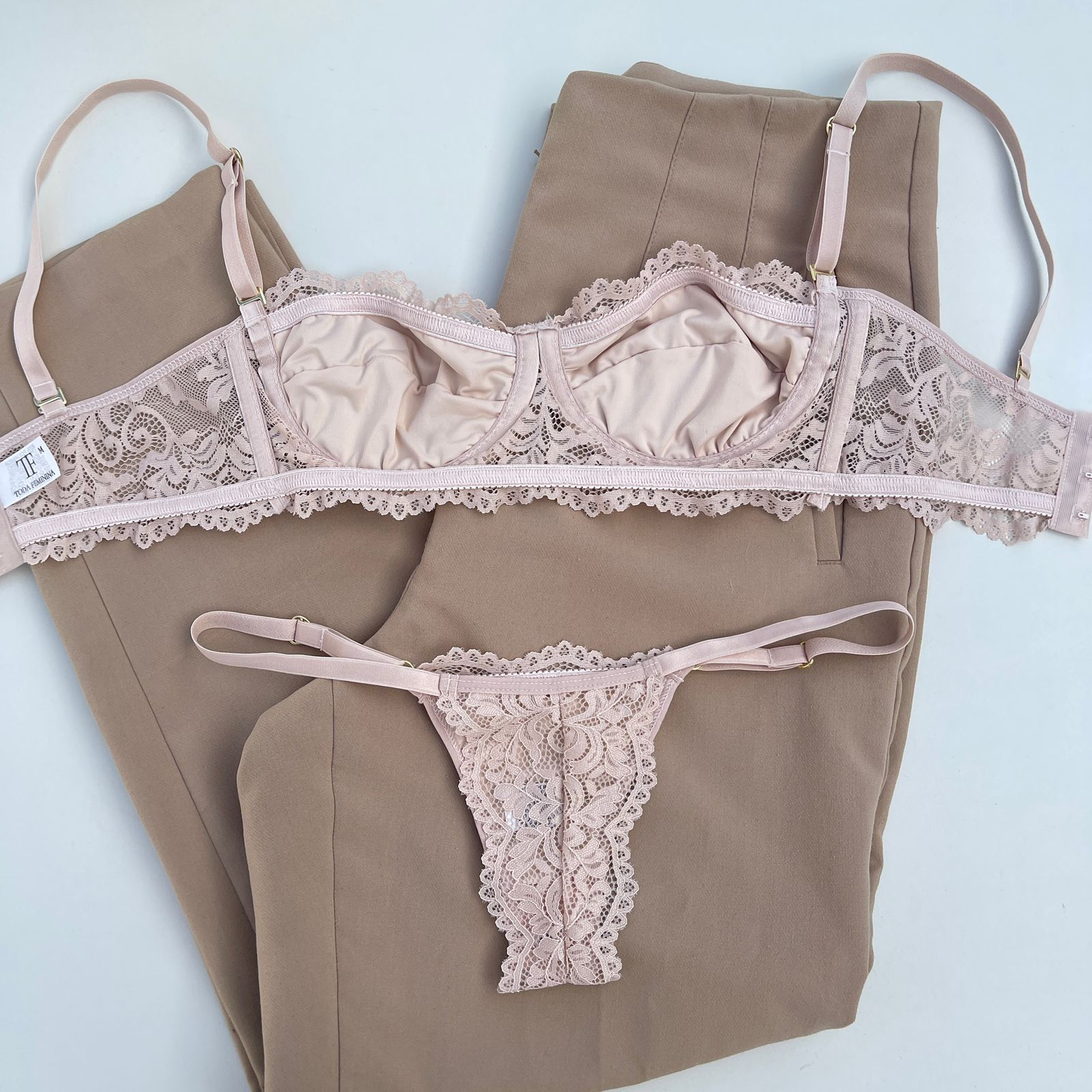 Conjunto de lingerie tomara que caia sutiã sem bojo com aro e calcinha string fio dental nude – Jasmine