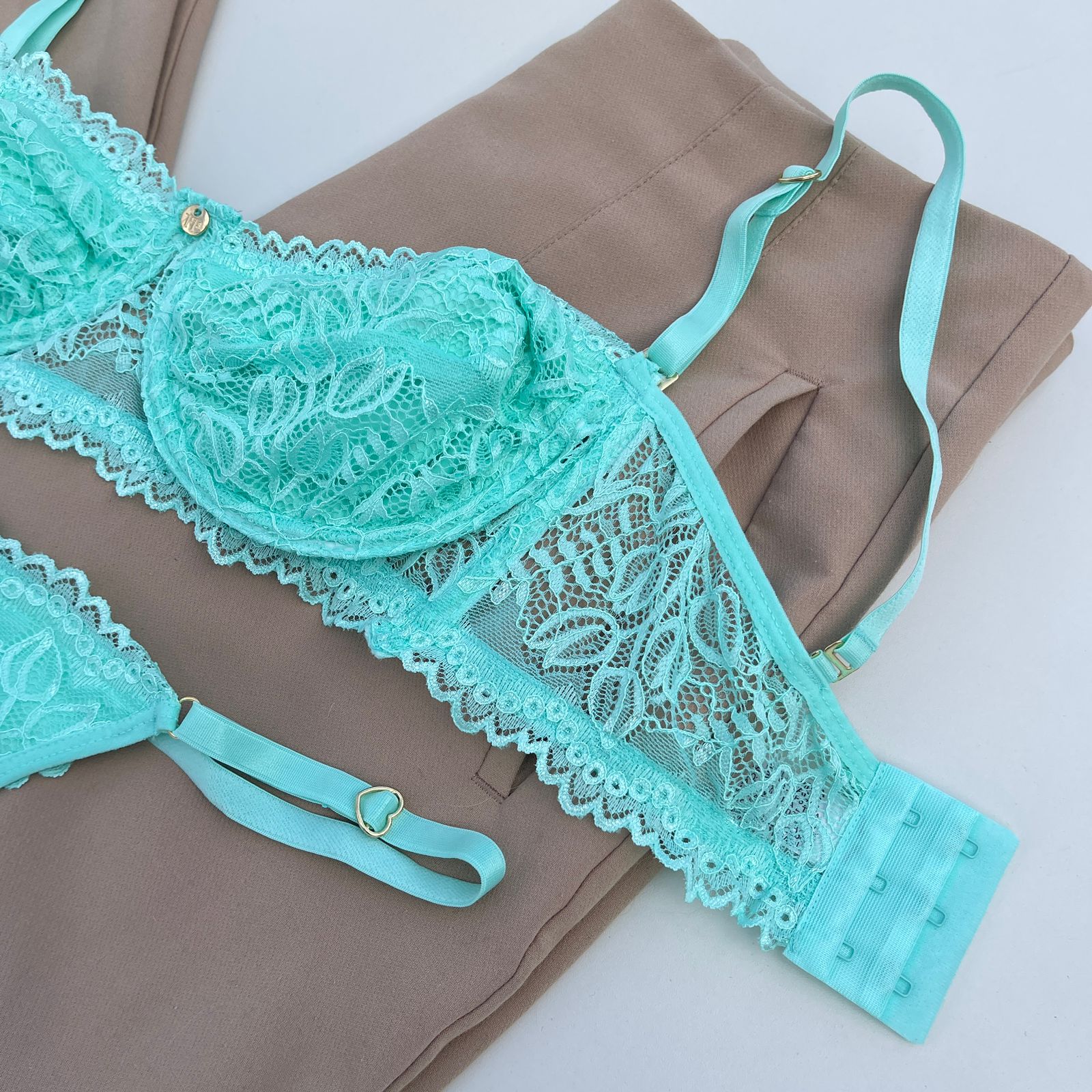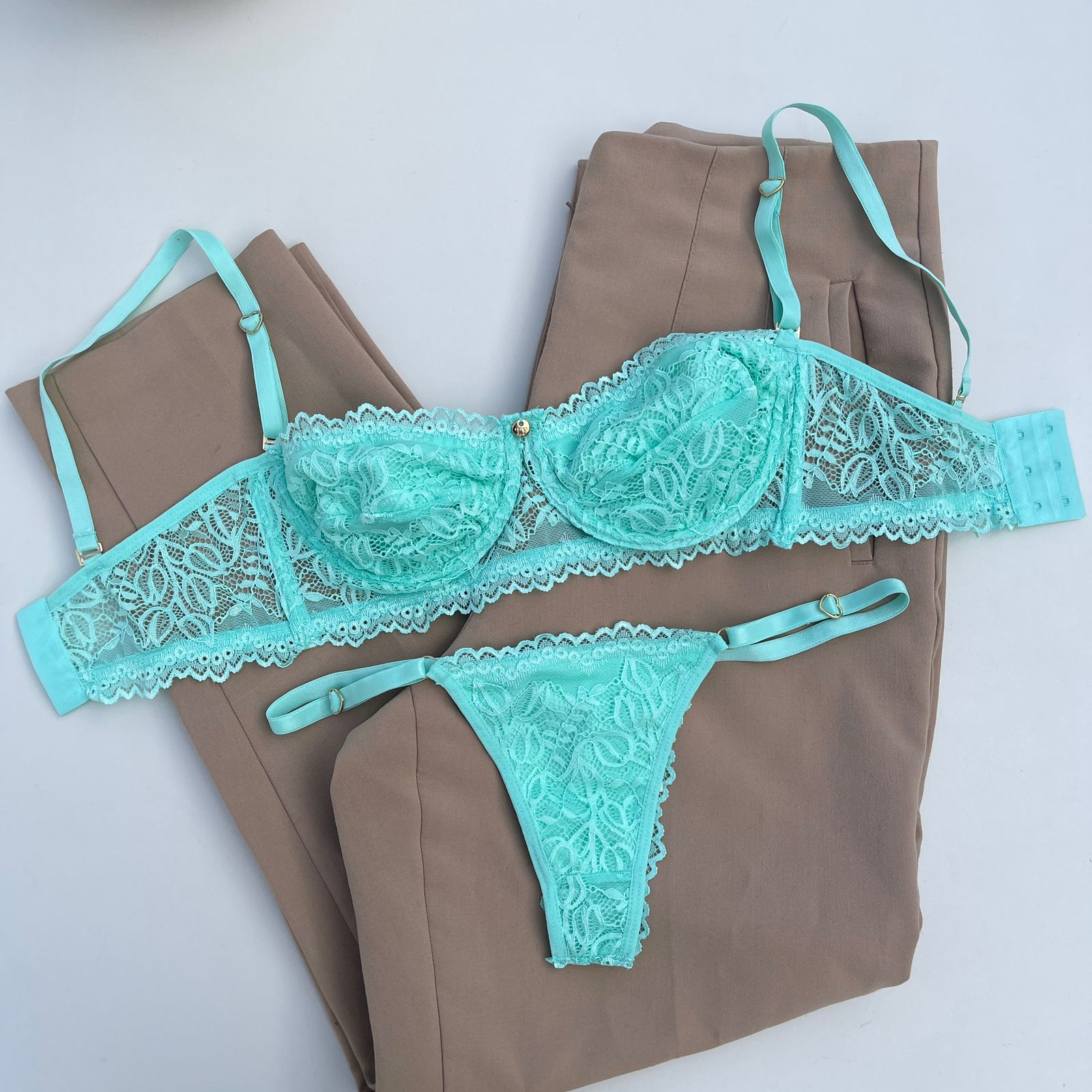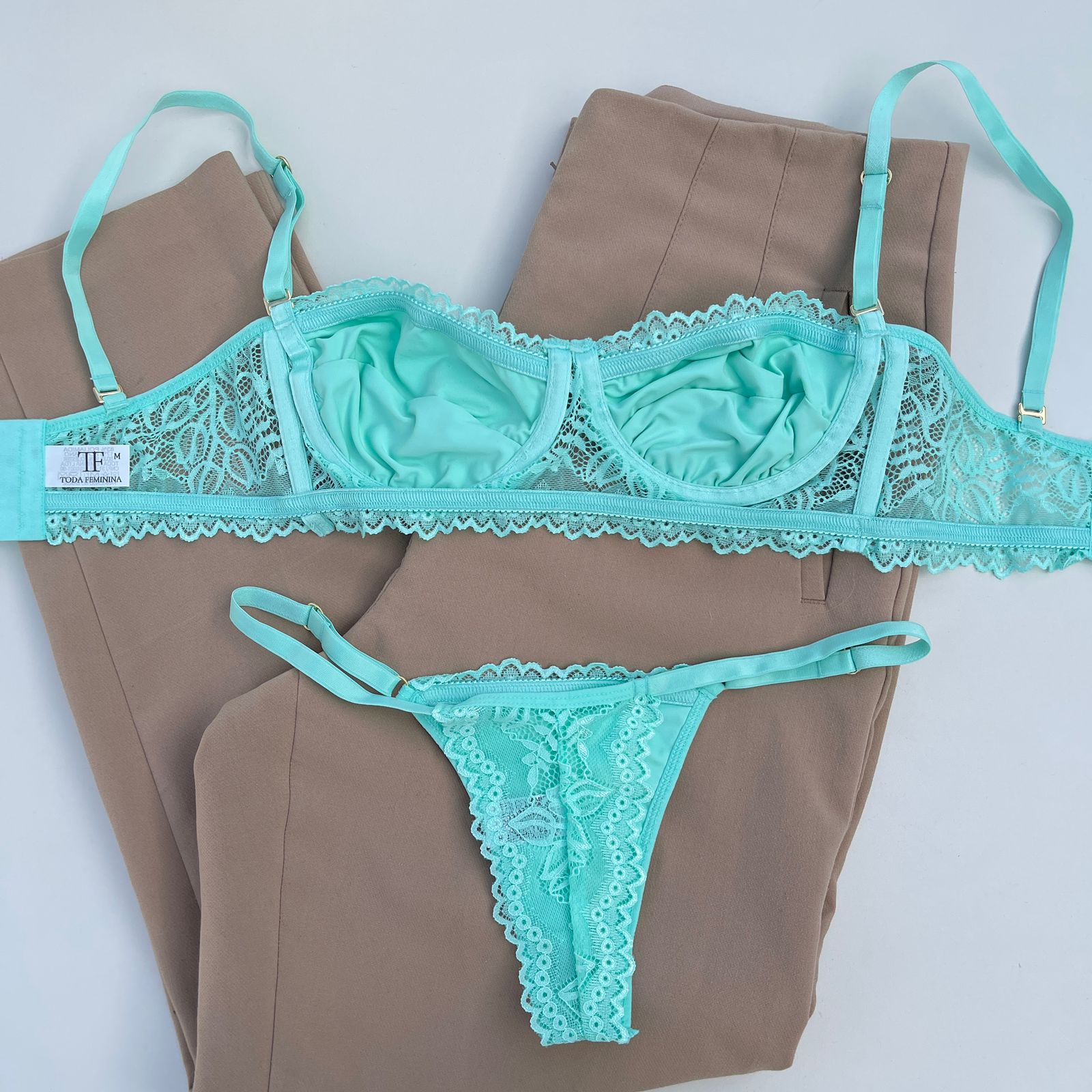 Conjunto de lingerie tomara que caia sutiã sem bojo com aro e calcinha string fio dental verde acqua – Jasmine