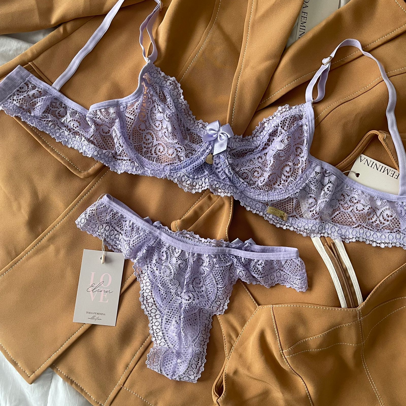 Conjunto de lingerie em renda sutiã sem bojo com aro e calcinha biquíni lavanda – Elena