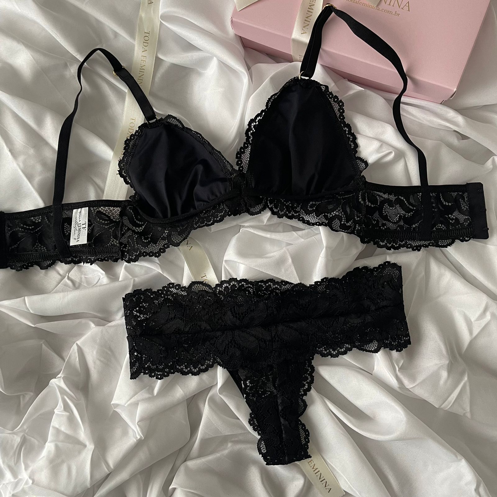 Conjunto De Lingerie Em Renda Sutiã Sem Bojo Sem Aro E Calcinha Fio Preto – Gabriela