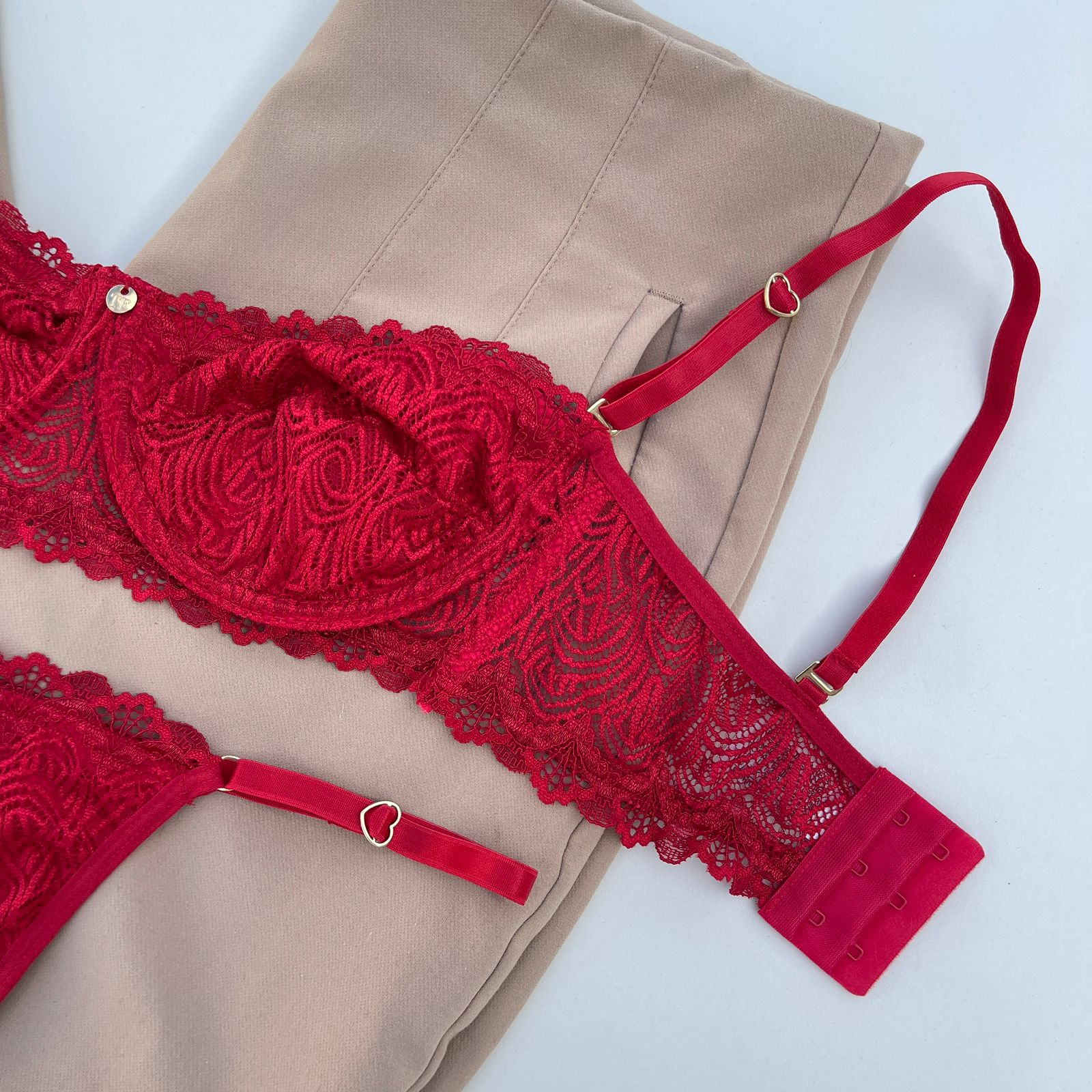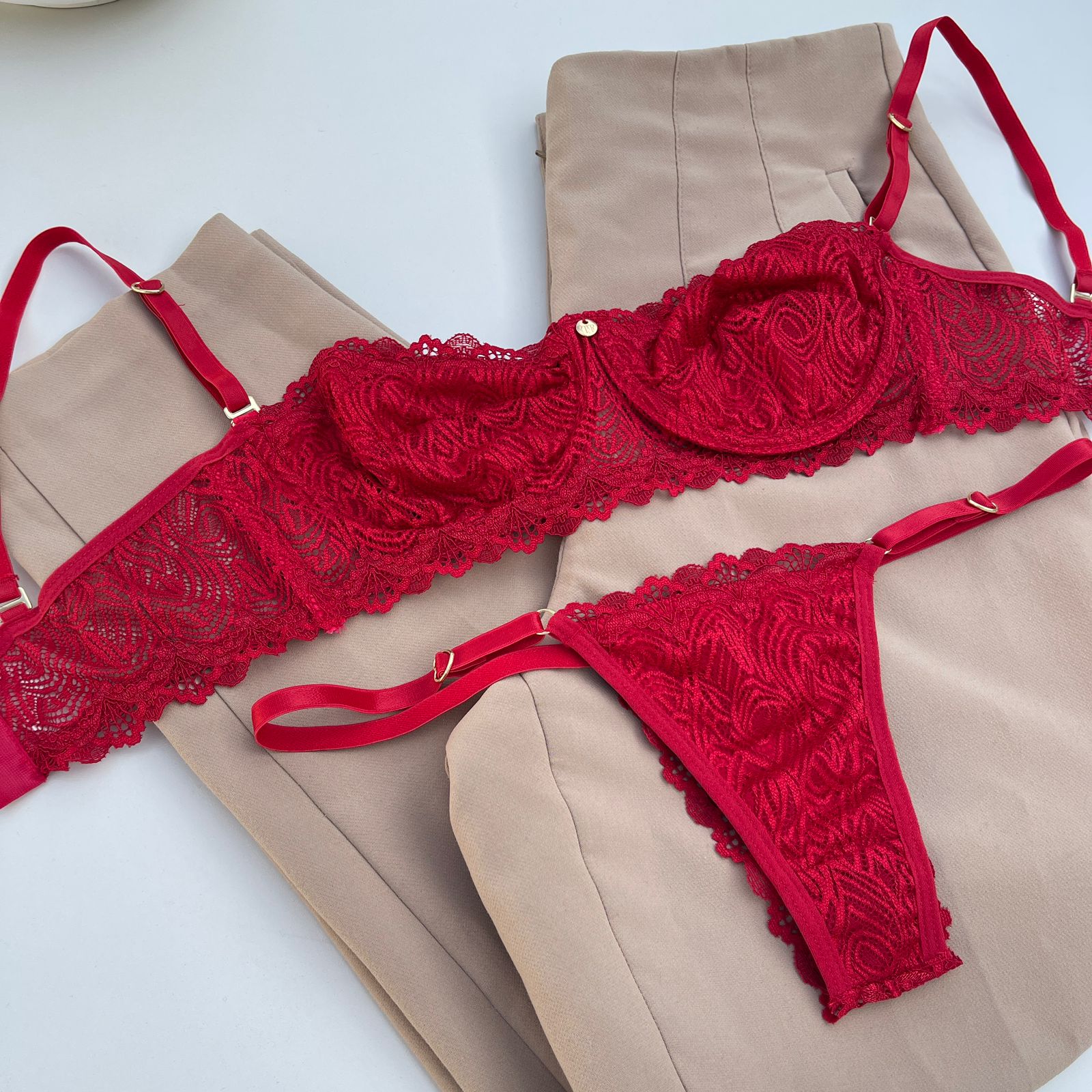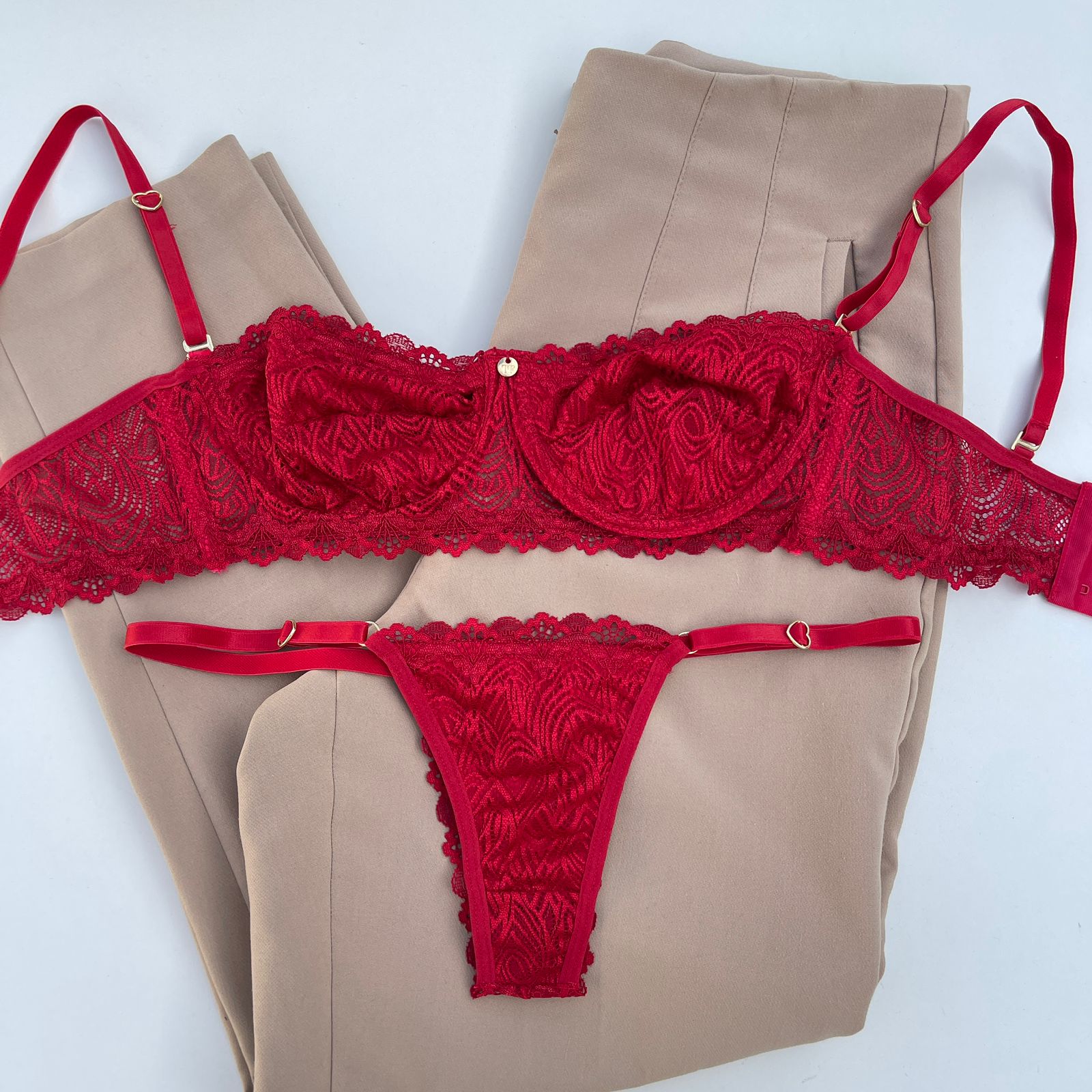 Conjunto de lingerie tomara que caia sutiã sem bojo com aro e calcinha string fio dental vermelho – Jasmine