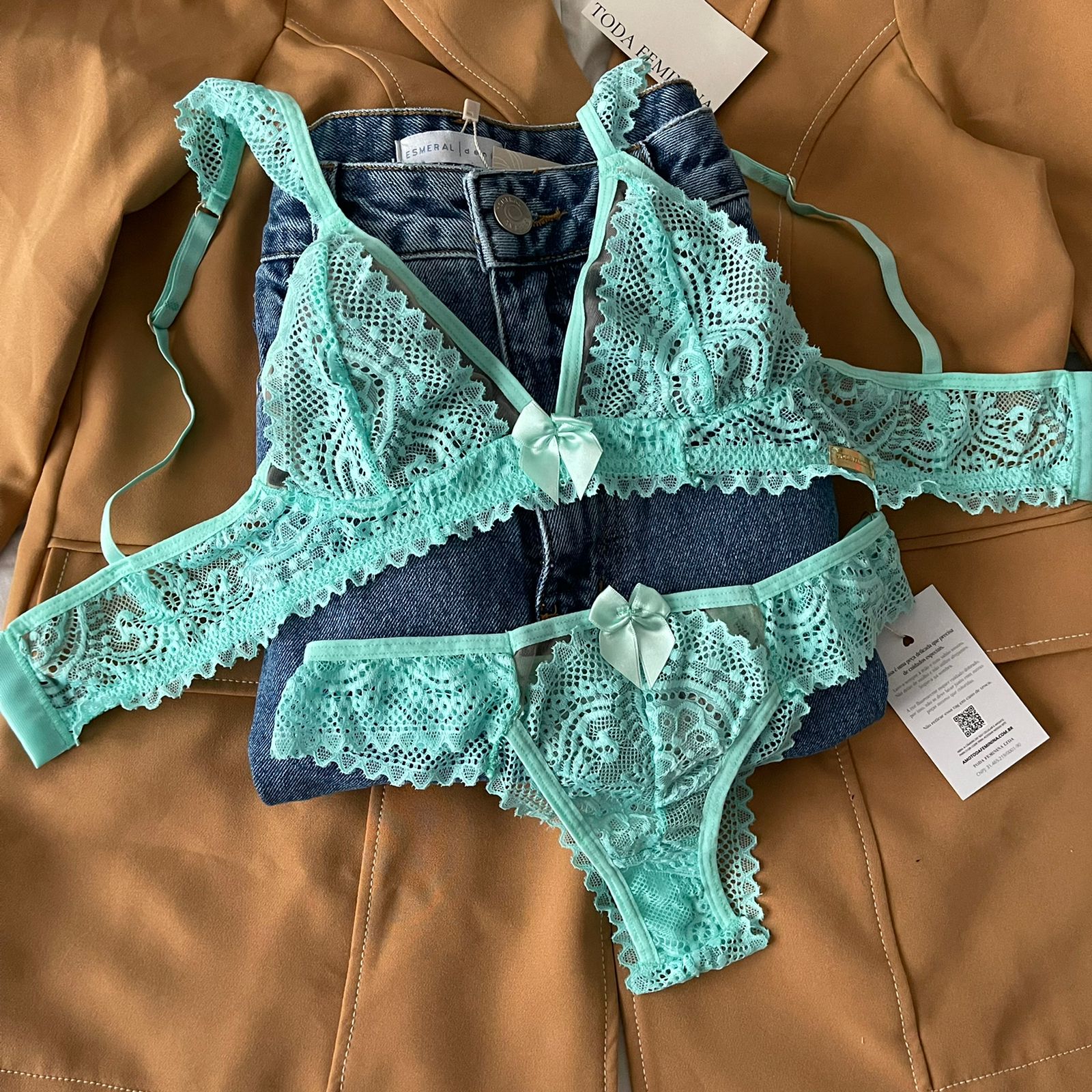 Conjunto de lingerie em renda e tule sutiã sem bojo sem aro e calcinha biquíni Verde Acqua – Lizzie