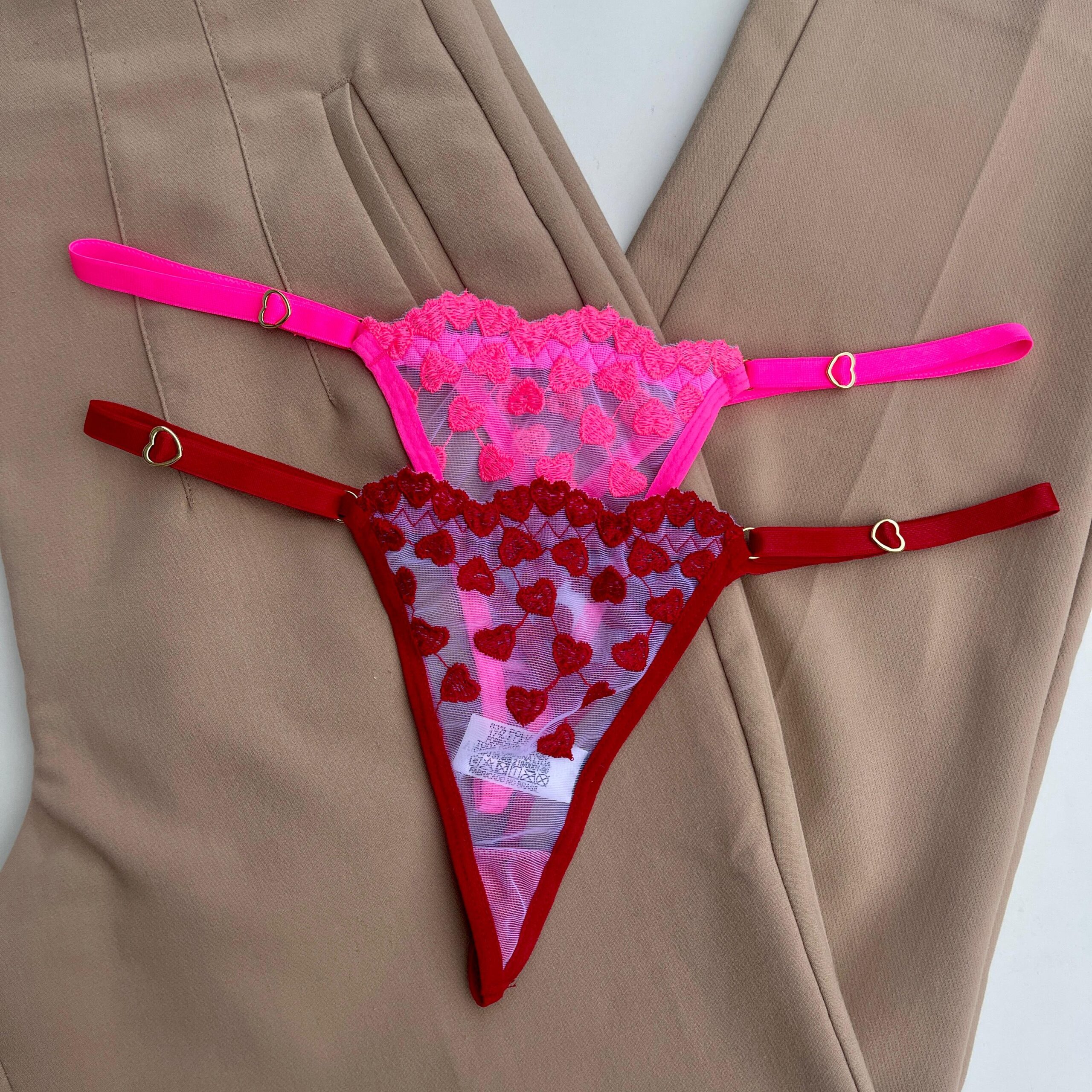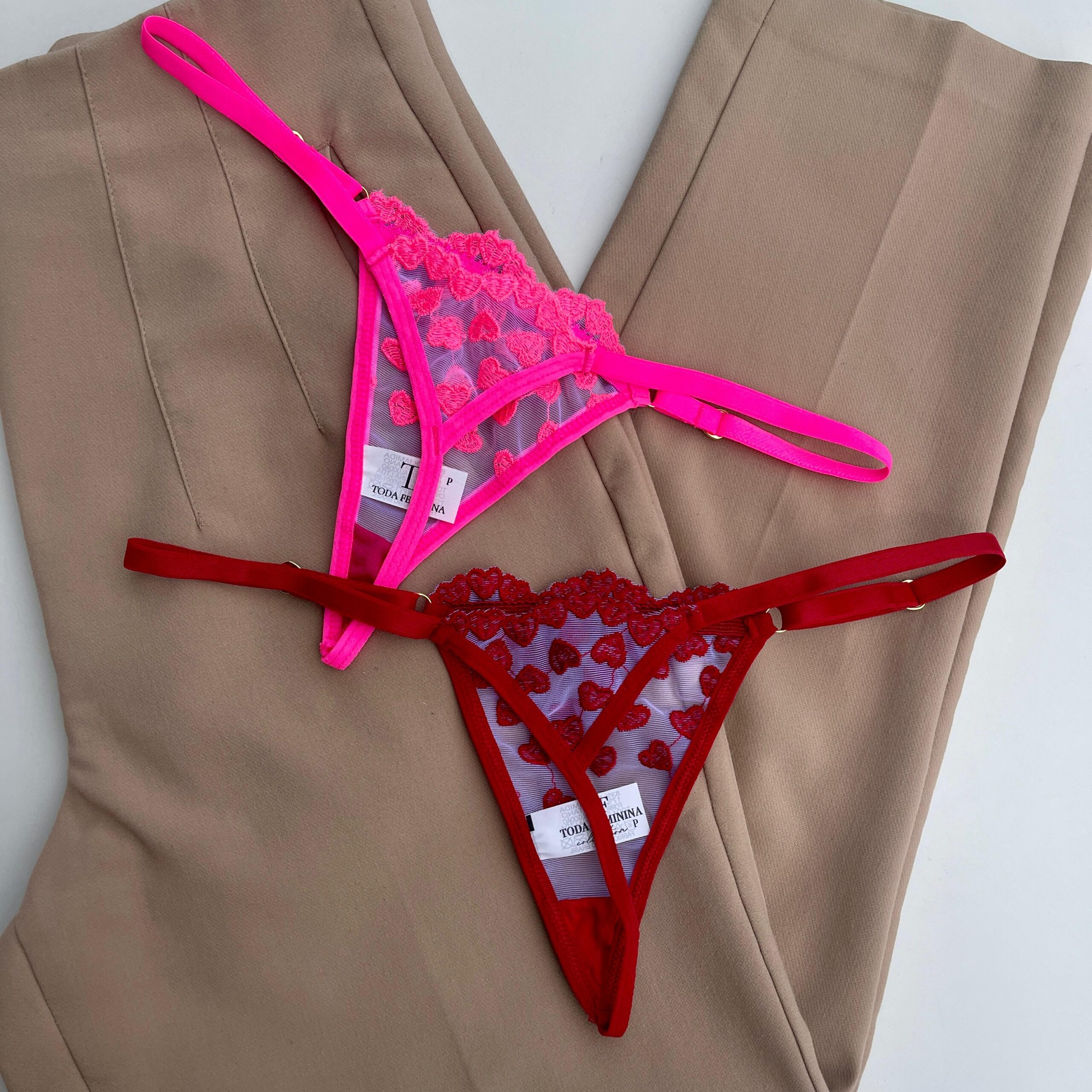 O kit é composto por duas calcinhas fio dental de tule, vermelha e rosa neon.