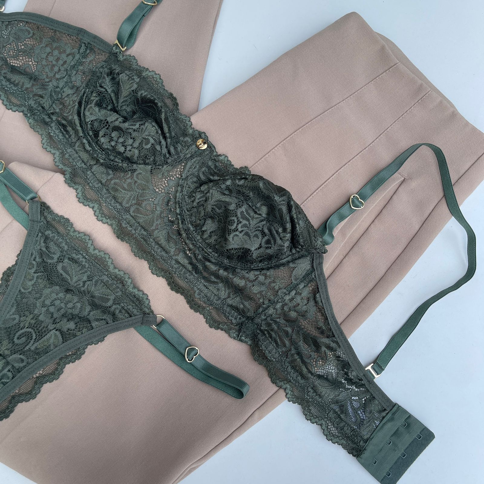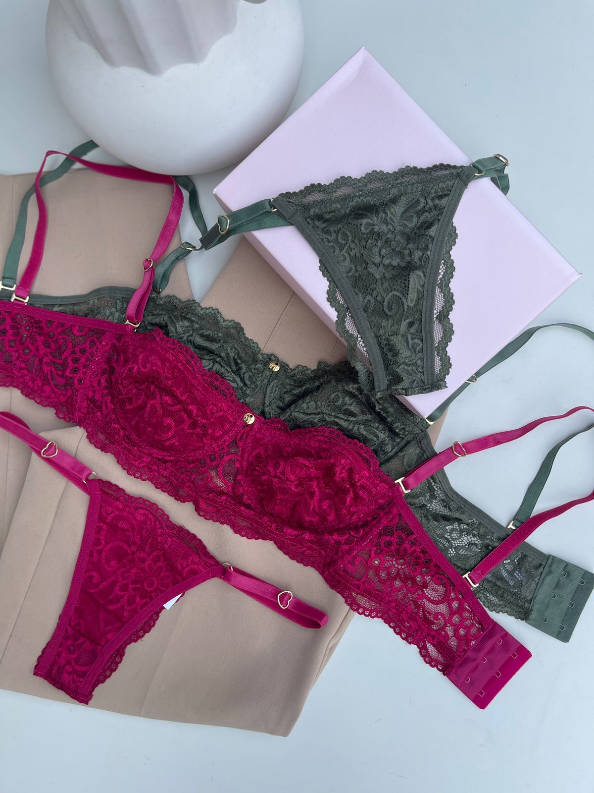 Kit 02 conjuntos de lingerie Jasmine Verde militar e Desejo