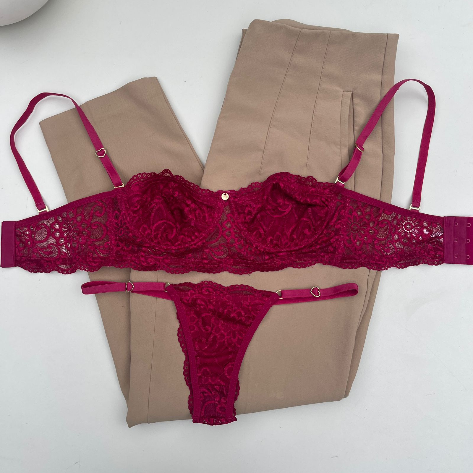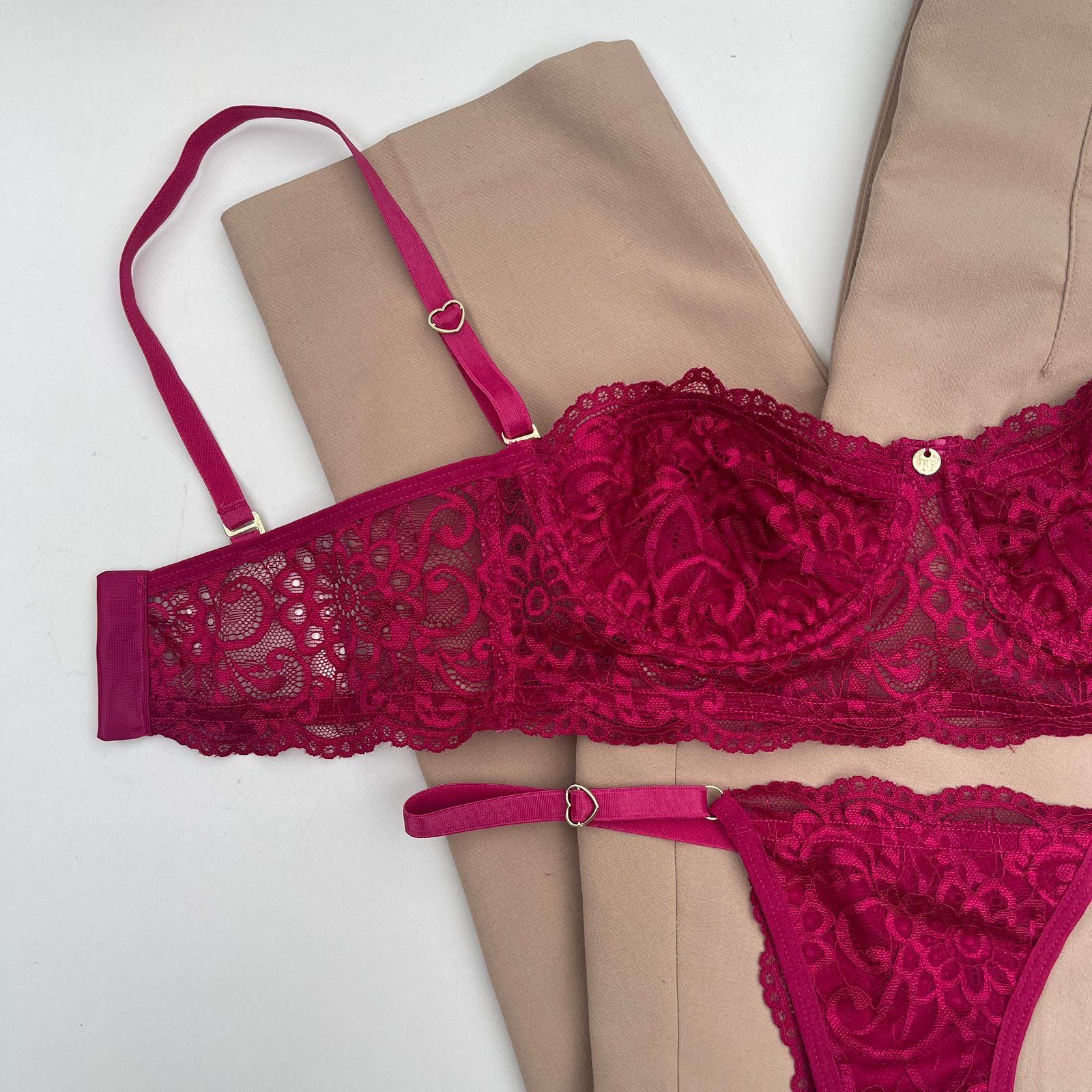 Kit 02 conjuntos de lingerie tomara que caia sutiã sem bojo com aro e calcinha string fio dental Verde militar e Desejo – Jasmine