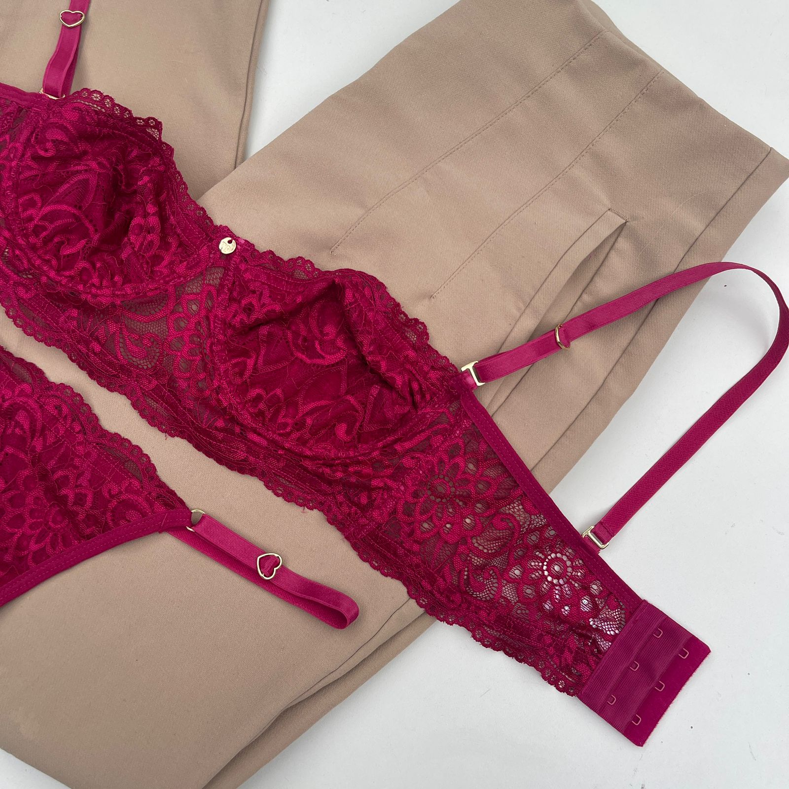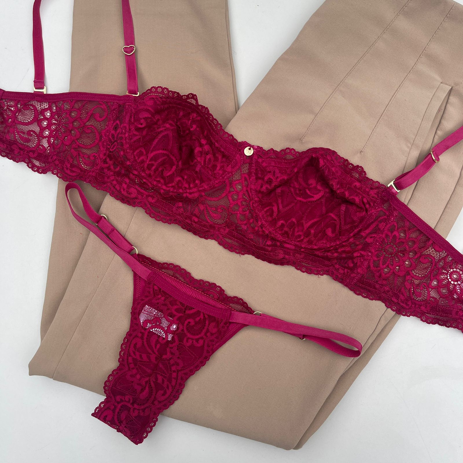 O conjunto Jasmine é uma peça exclusiva, desenvolvida em renda com tule anti alérgica.