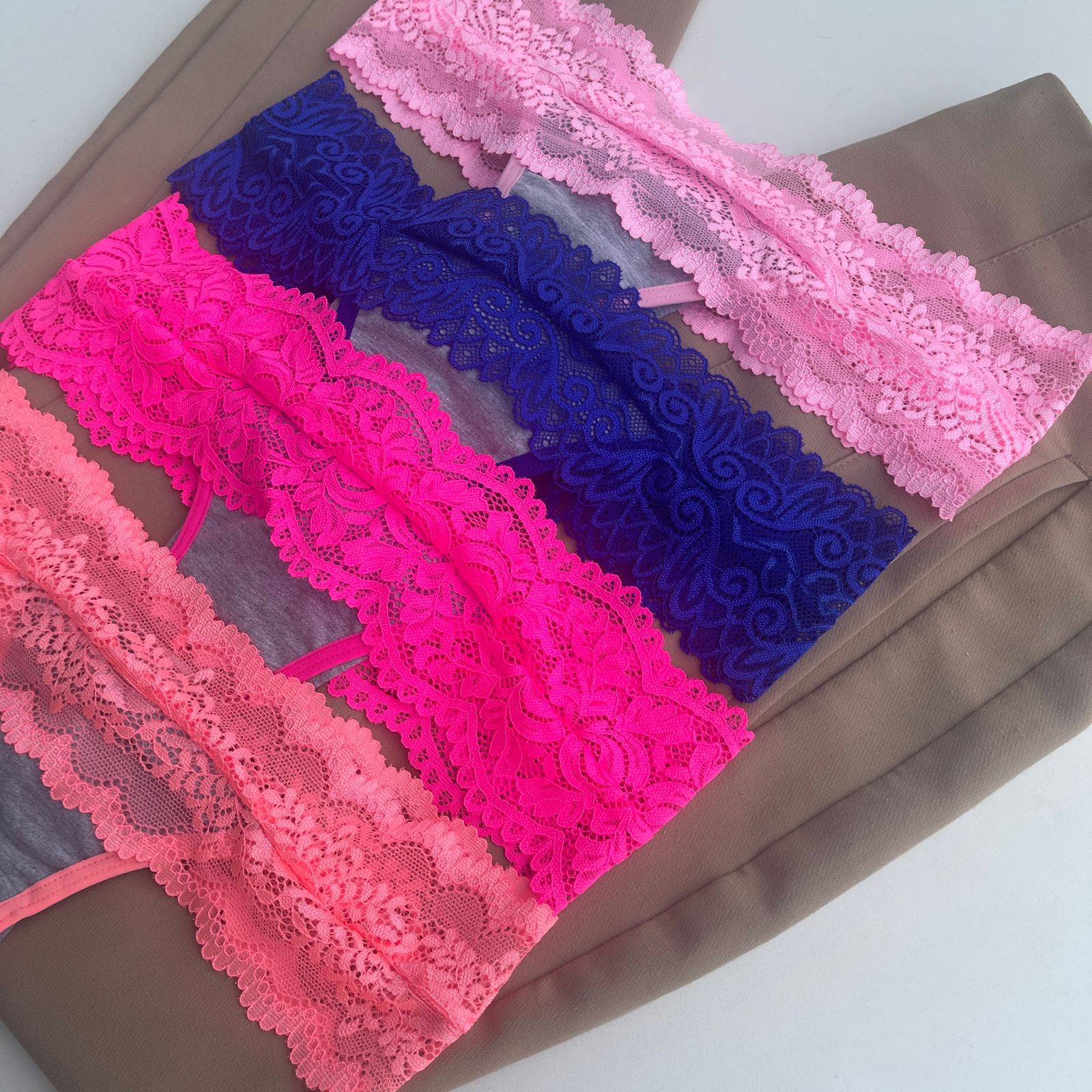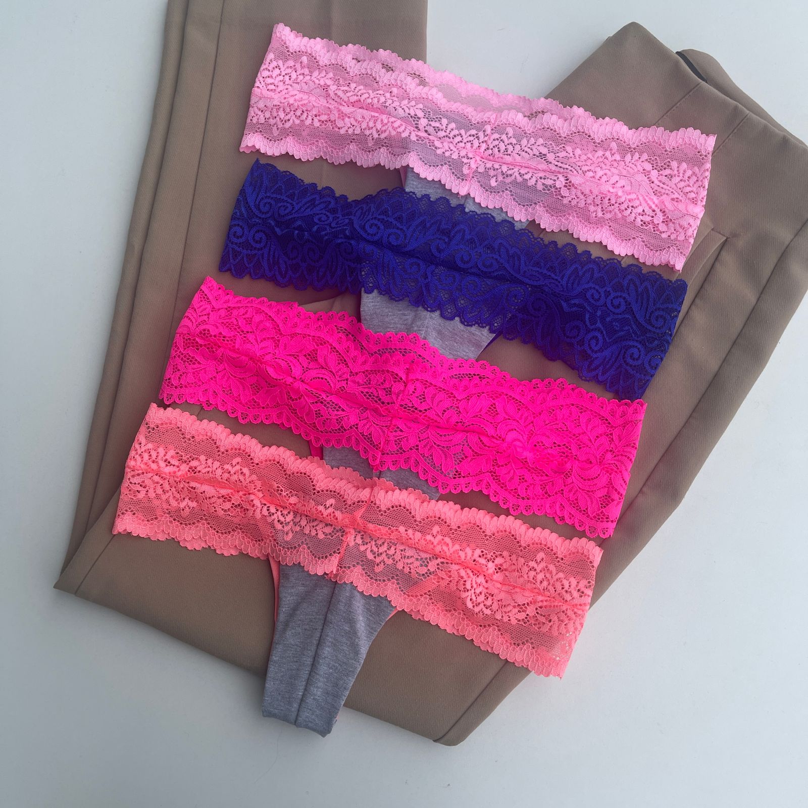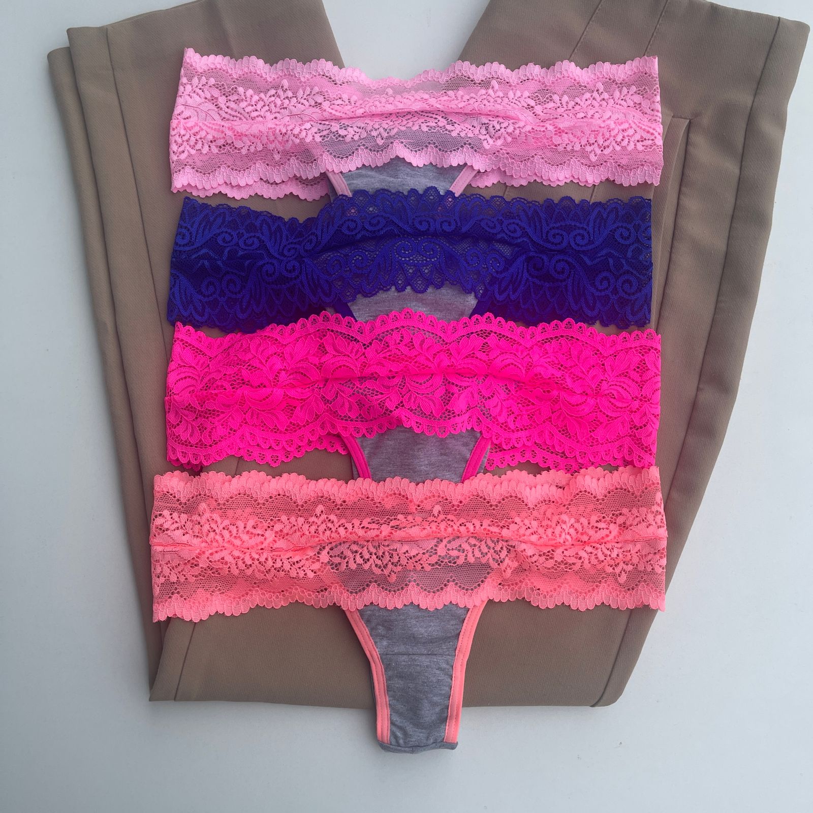 O kit é composto por quatro calcinhas fio duplo de algodão, com cós em renda, nas cores rosa babaloo, azul bic, rosa neon e coral.