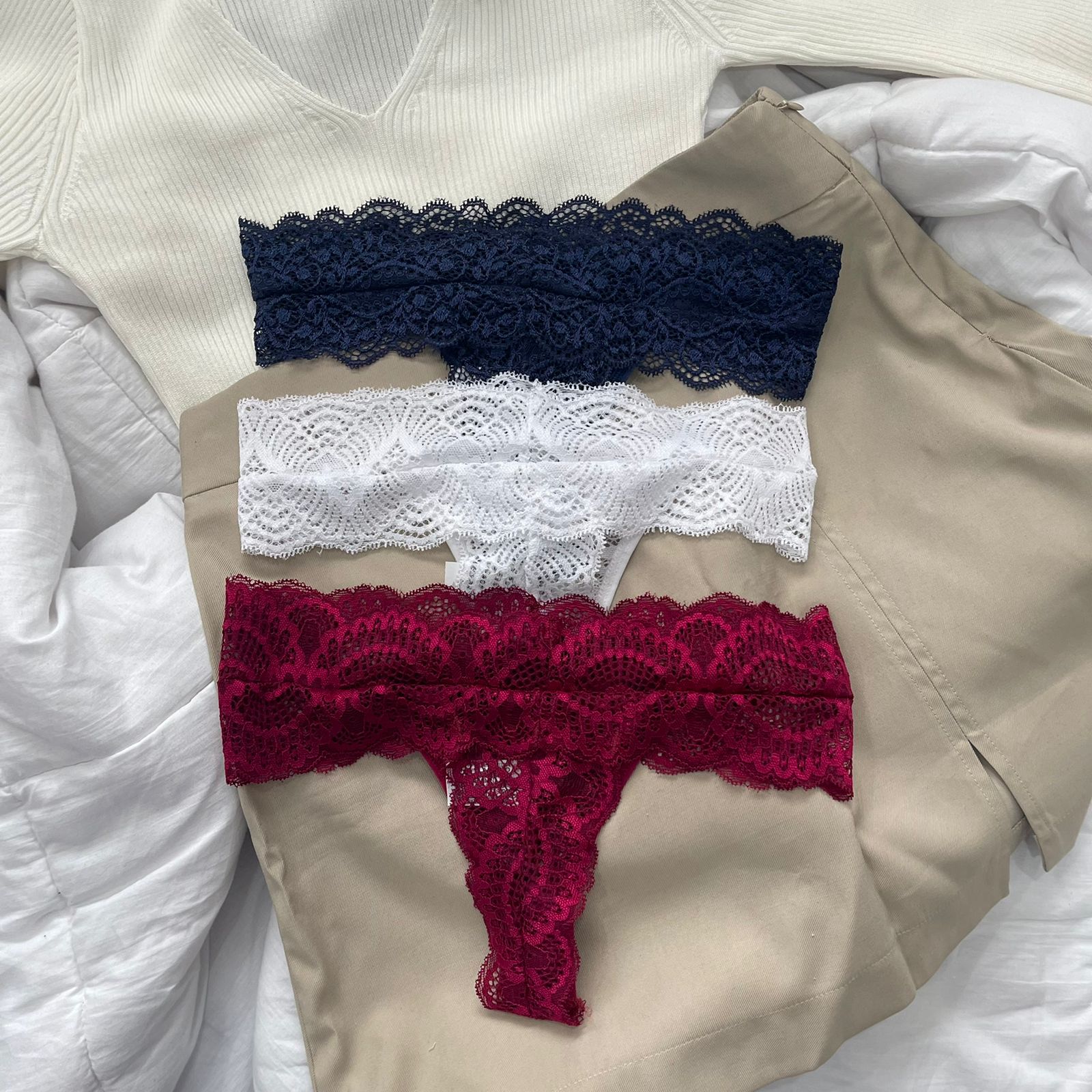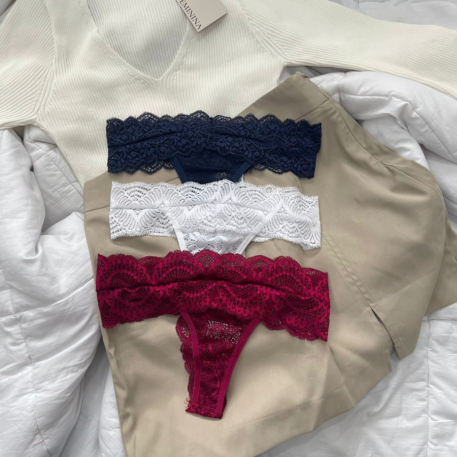 O kit é composto por três calcinhas fio duplo de renda, Azul Marinho, Branco e Desejo.