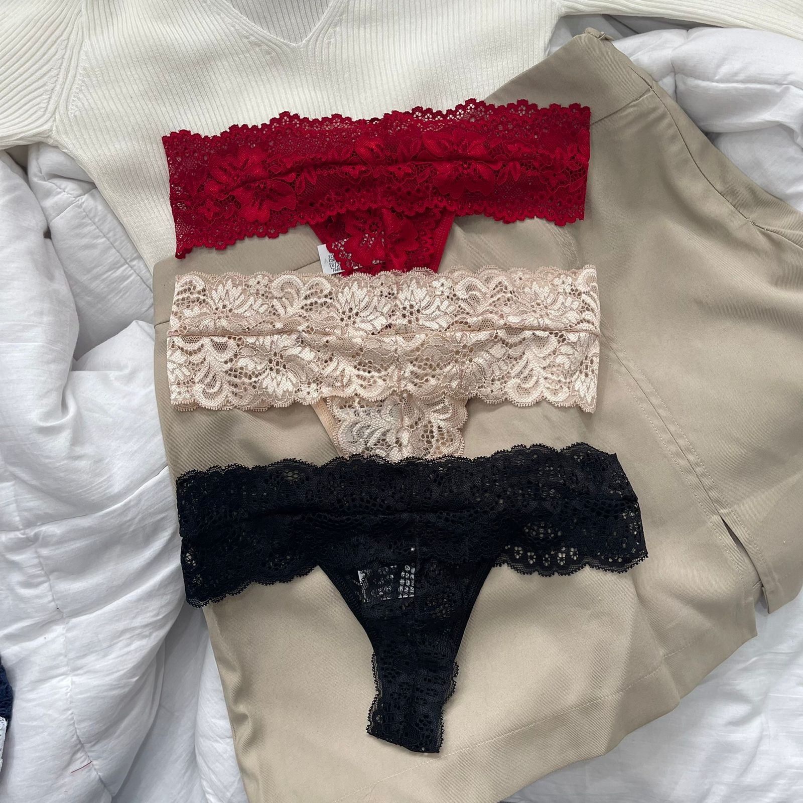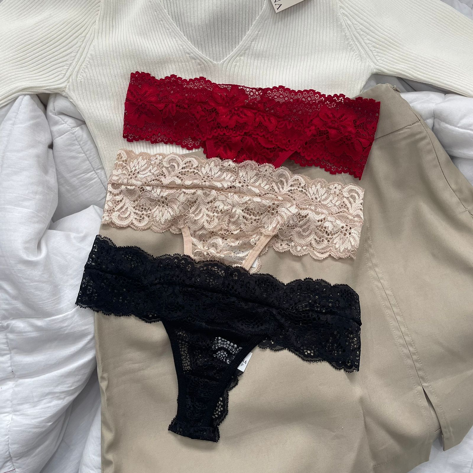 O kit é composto por três calcinhas fio duplo de renda, Vermelho, Nude e Preto.