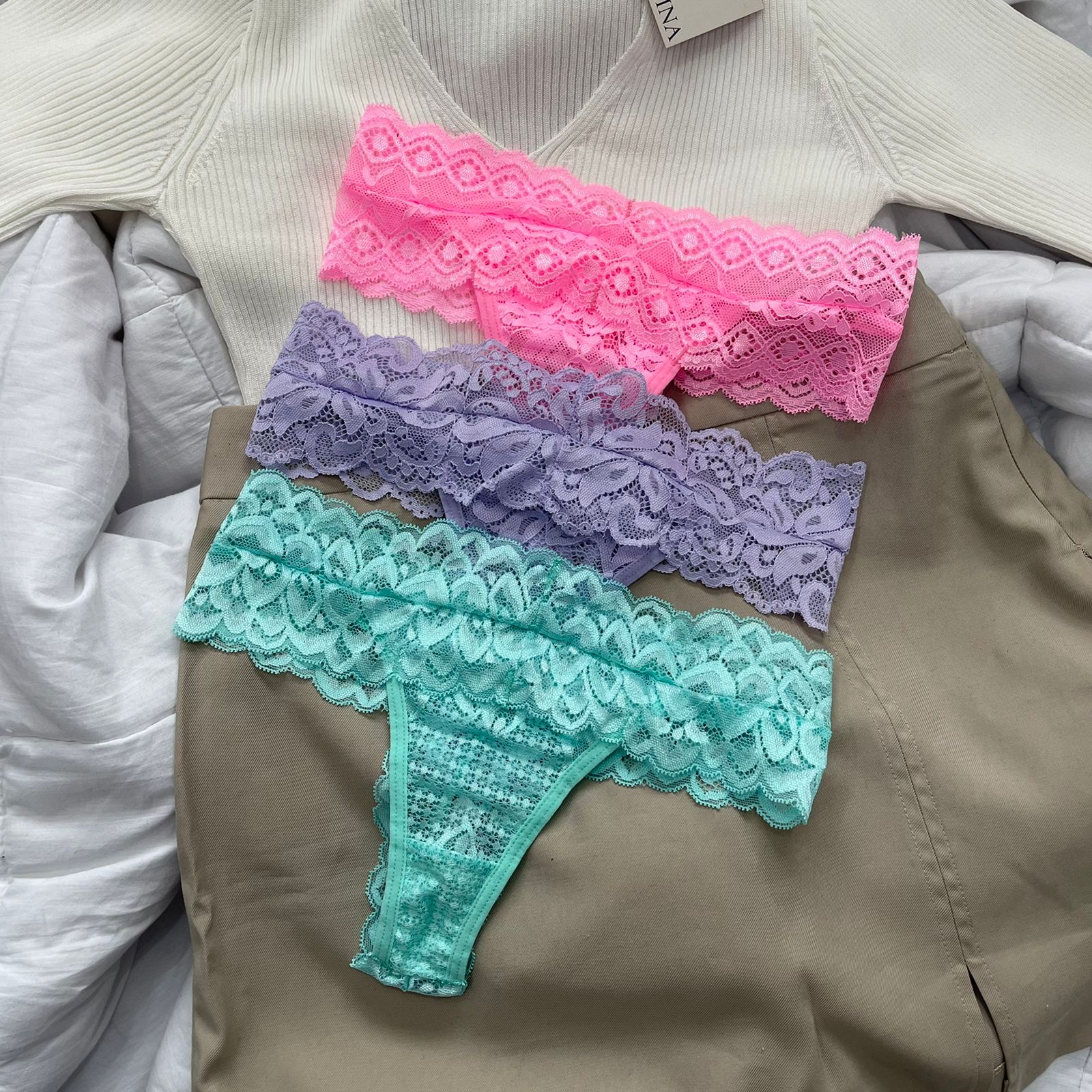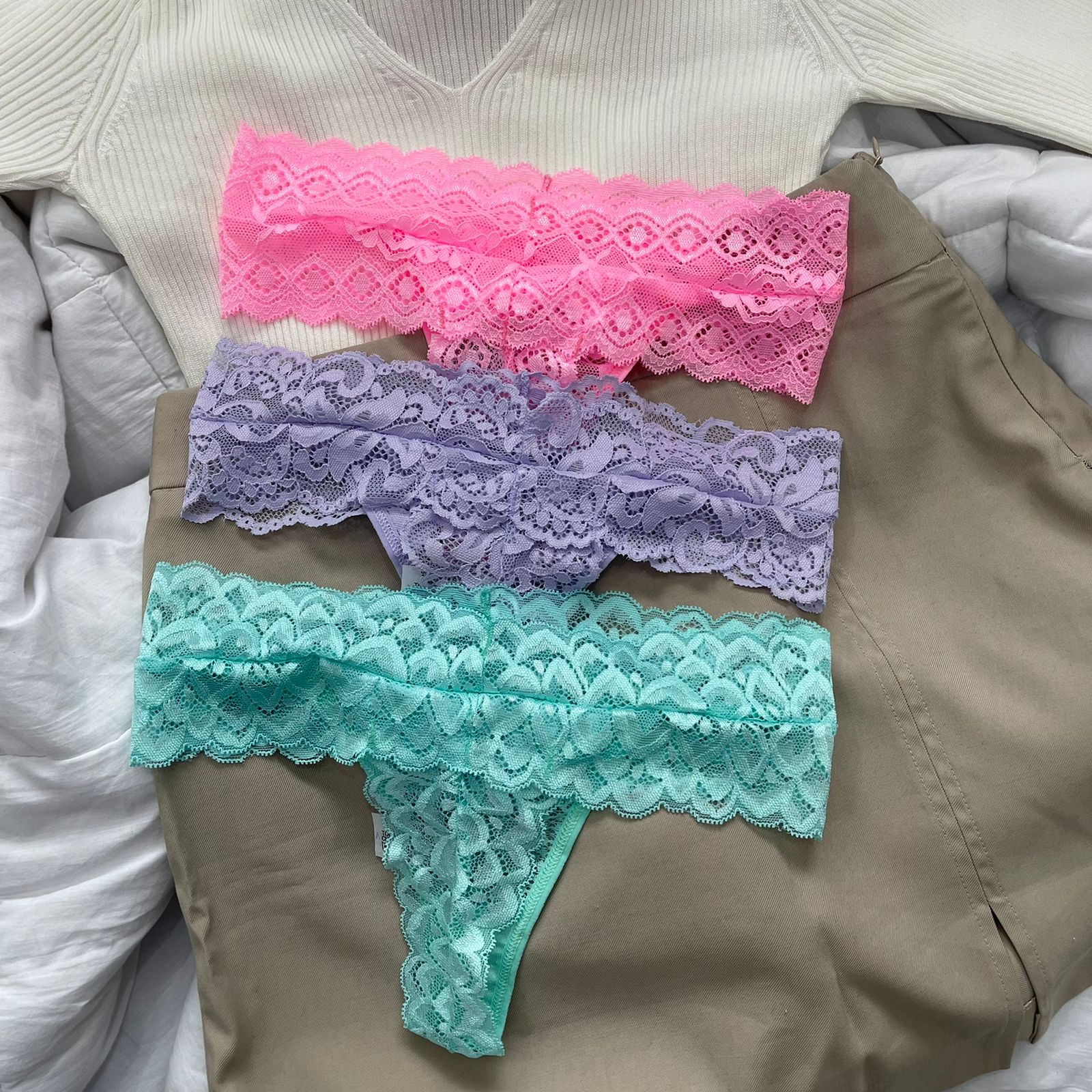 O kit é composto por três calcinhas fio duplo de renda, Rosa Babaloo, Lavanda e Verde Acqua.