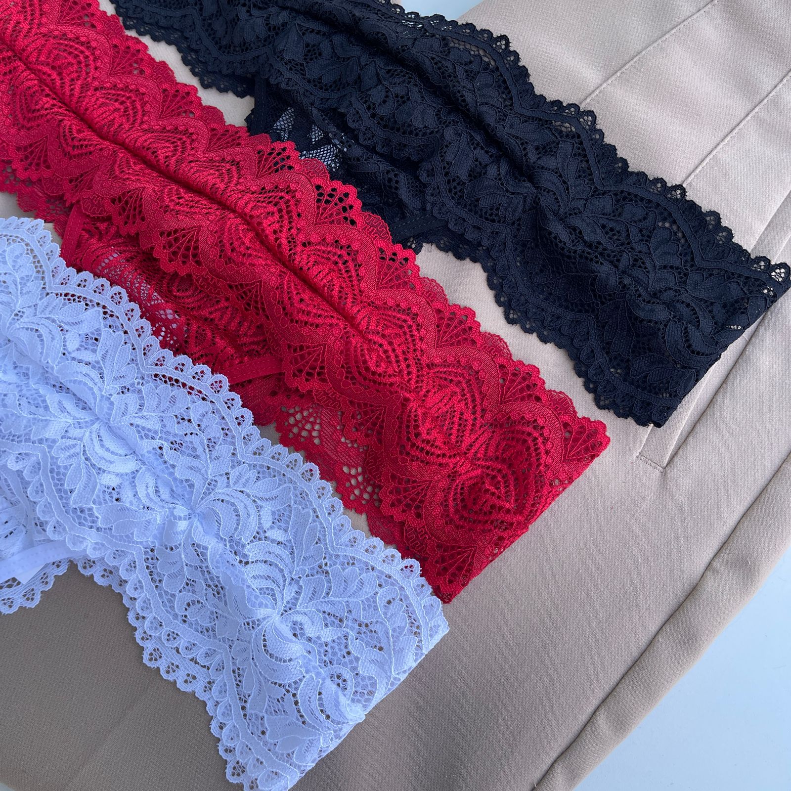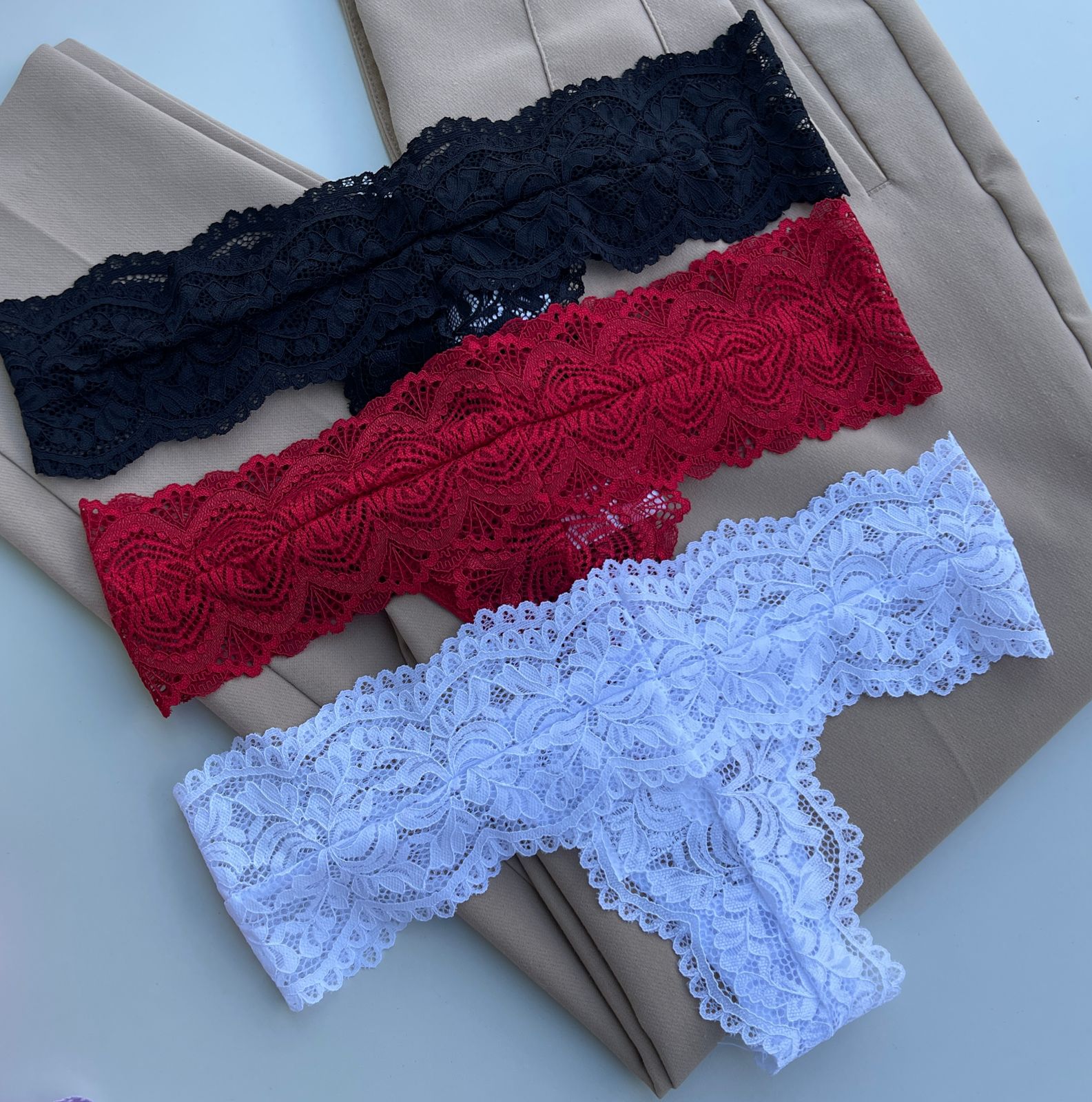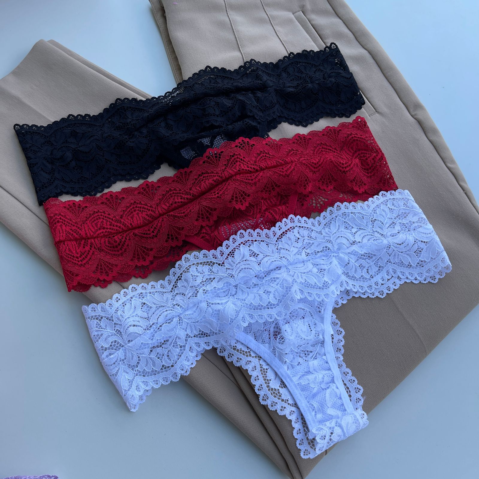 O kit é composto por três calcinhas fio duplo de renda, vermelha, preta e branca.