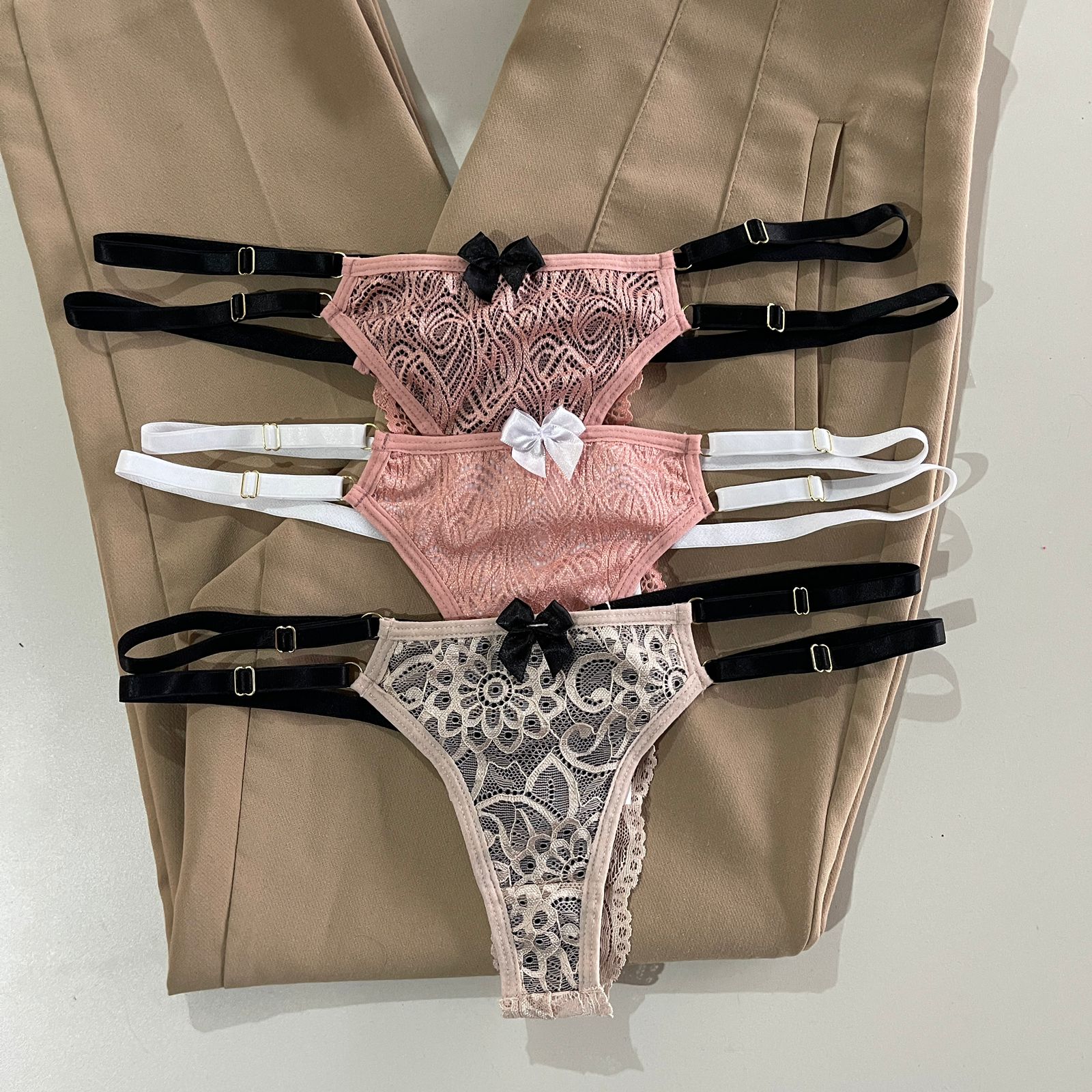 O kit é composto por três calcinhas de regulagem dupla, com forro de microfibra na frente.