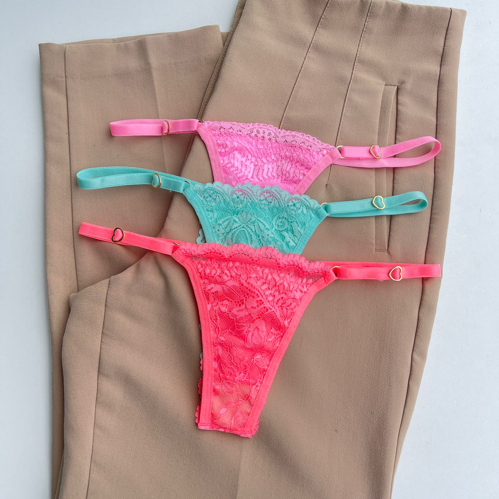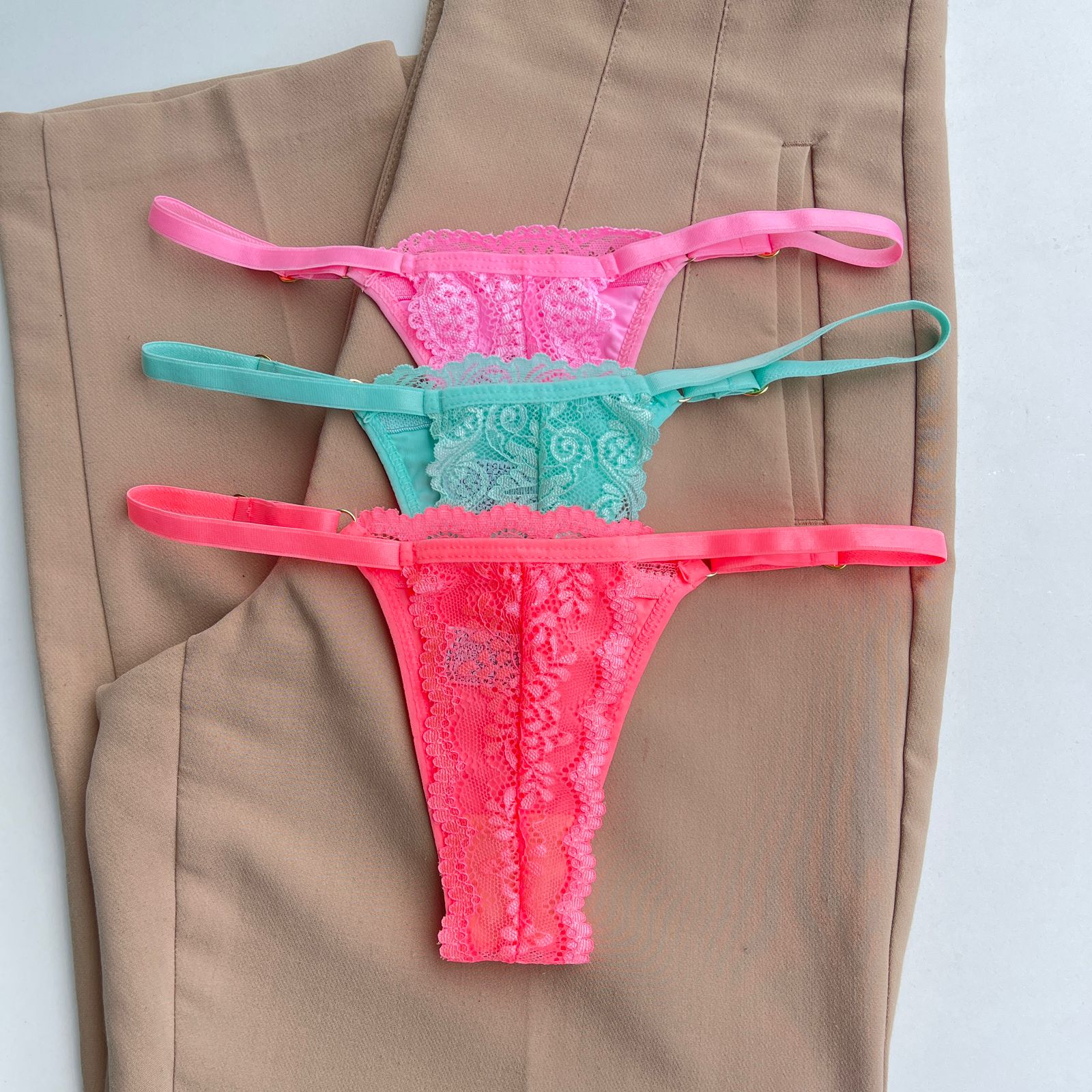 O kit é composto por três calcinhas de regulagem, rosa babaloo, verde acqua e coral, com forro de microfibra na frente.