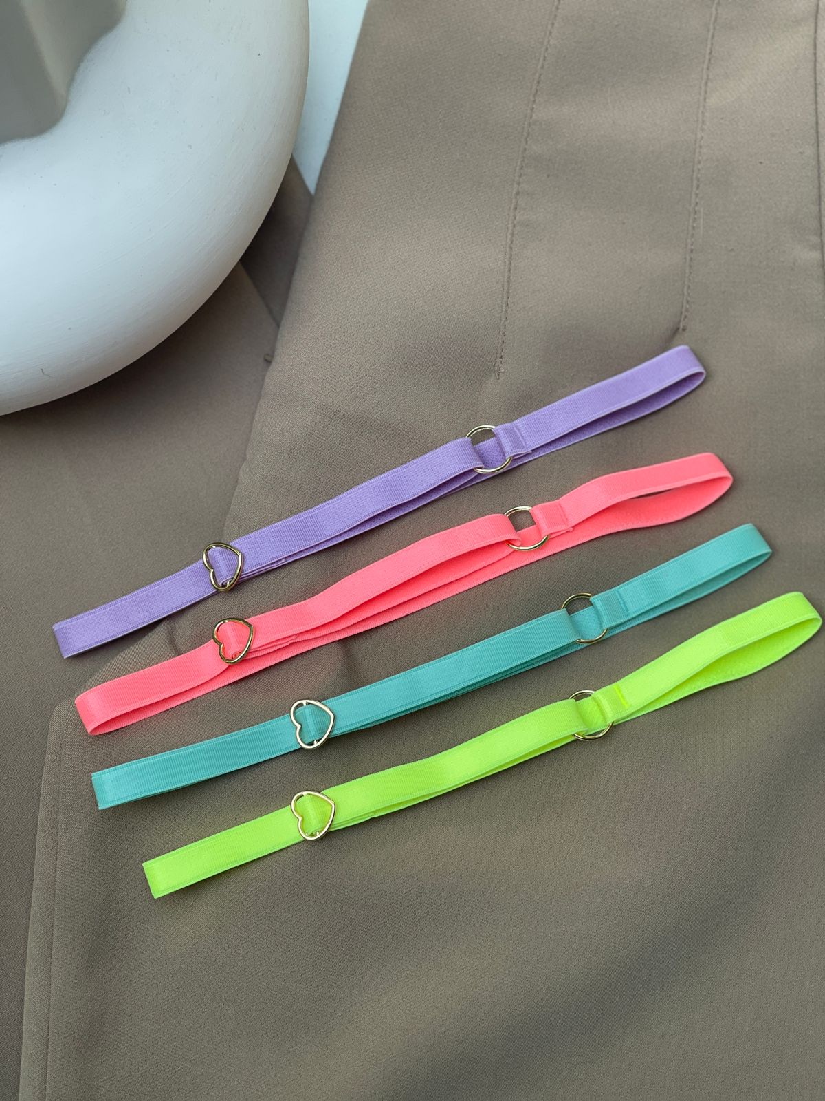 Kit 04 acessórios para perna (persex), com regulagem. Regulador de coração, metais banhados à ouro 24k. Nas cores: lavanda, coral, verde acqua e verde neon.