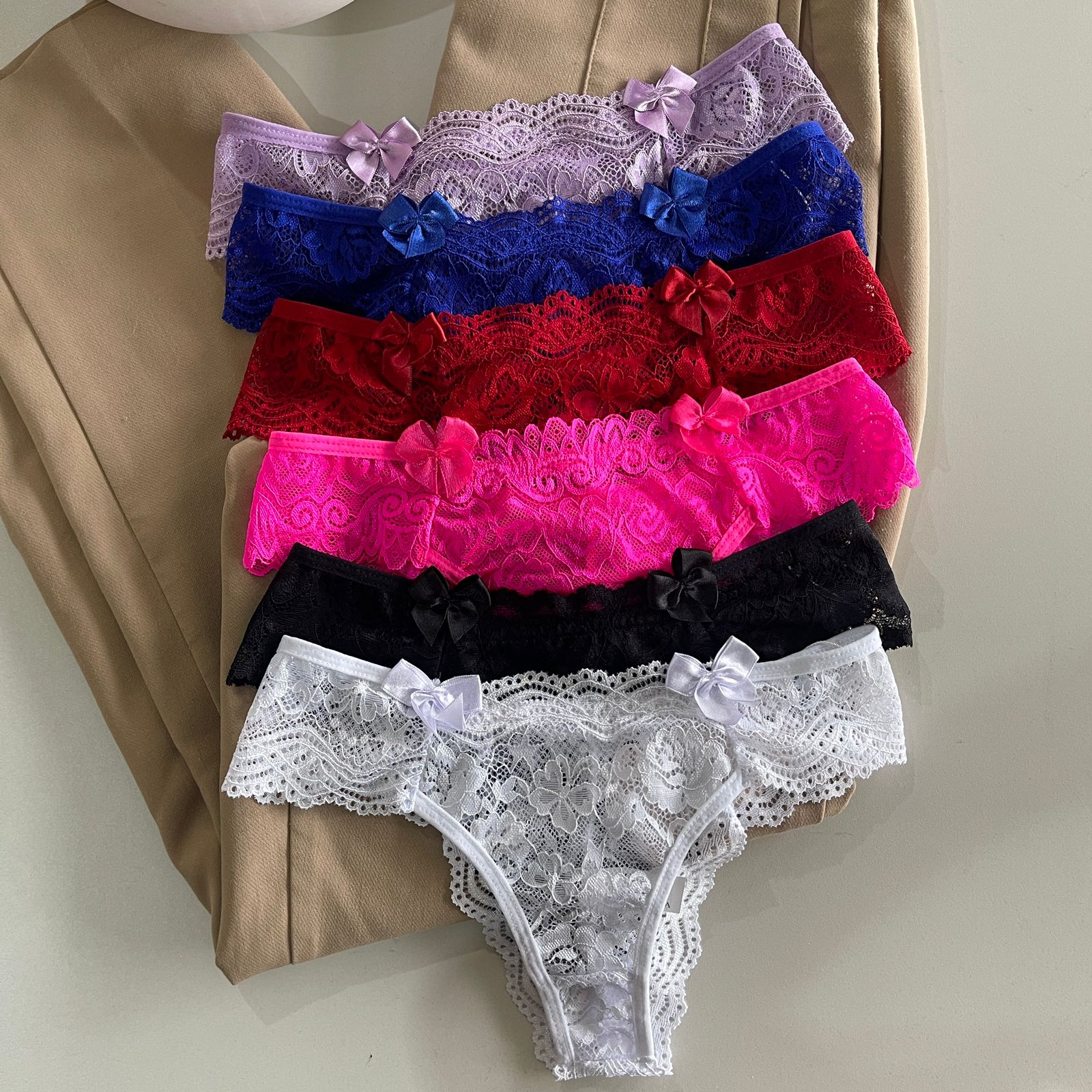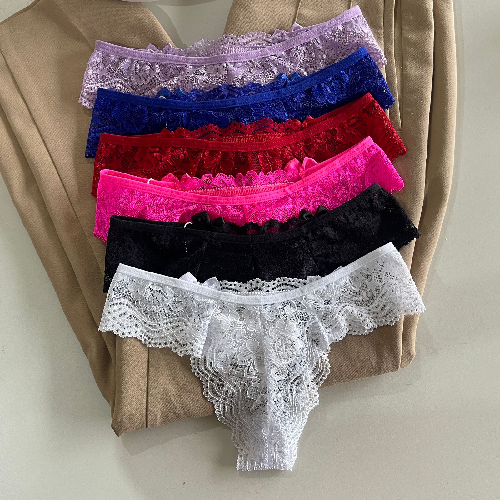 O kit é composto por seis calcinhas, lavanda, azul bic, vermelha, r0sa neon, preto e branca