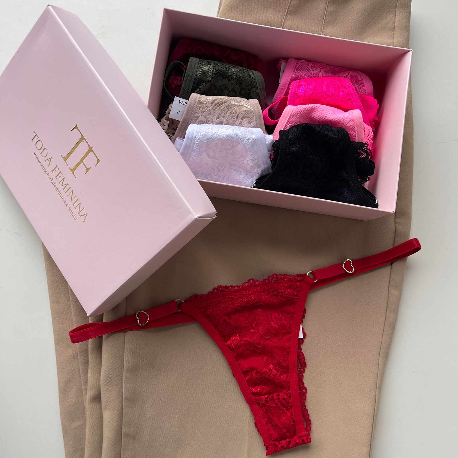 O kit é composto por nove calcinhas de regulagem, desejo, verde militar, nude, branca, rosa bliss, rosa neon, rosa babaloo, preta e vermelha, com forro de microfibra na frente.