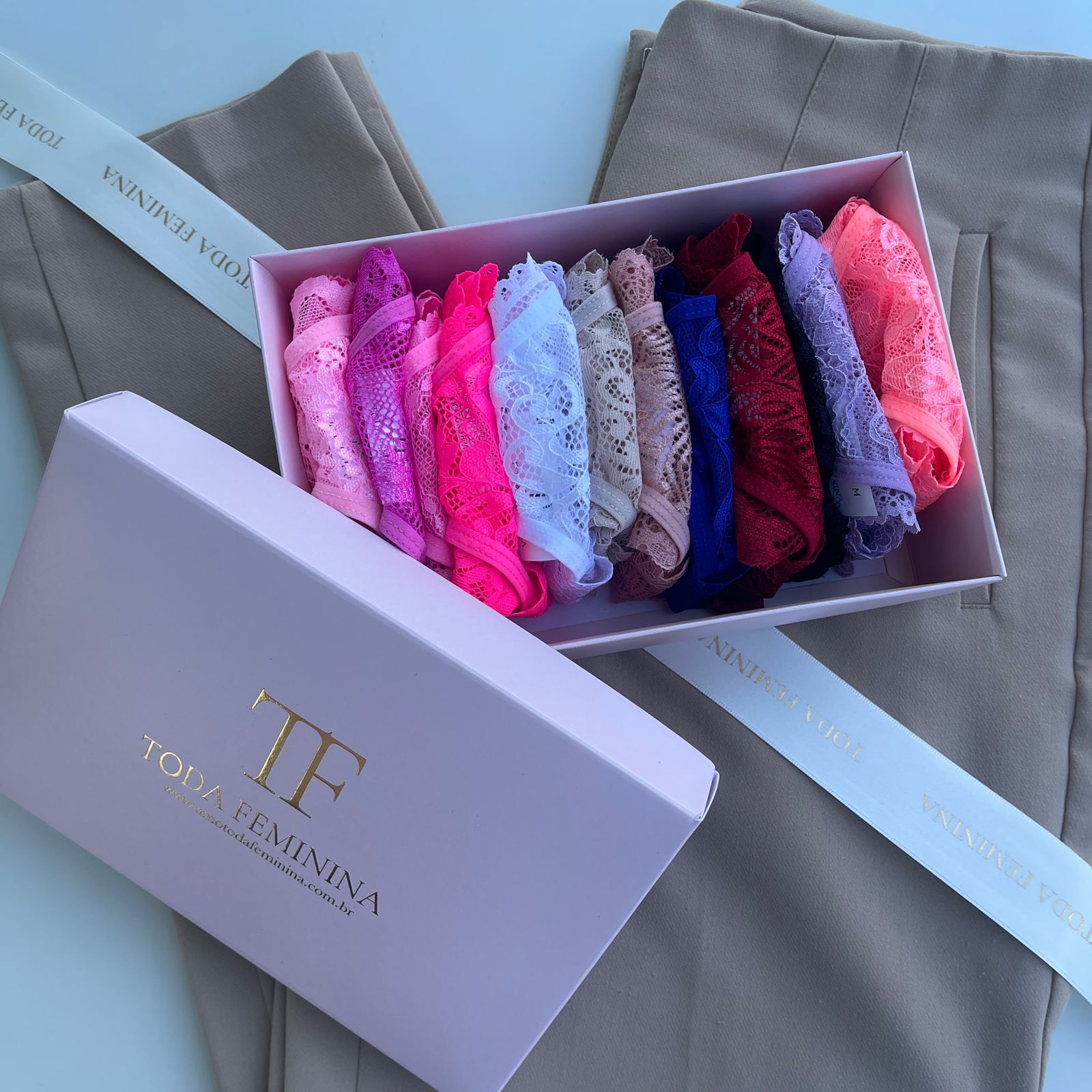 O kit é composto por doze calcinhas fio duplo de renda, rosa babaloo, rosa barbie, rosa bliss, rosa neon, branca, nude, romance, azul bic, vermelha, preta, lavanda e coral.